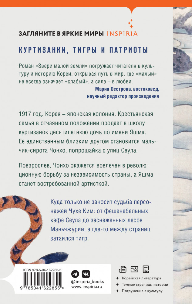 💳 Оплатить за товар можно при получении 🇰🇿 Есть бесплатная доставка по Казахстану от 1 дня 🎁 Копите бонусы с каждой покупки Серия: Loft. Азиатский бестселлер 1917 год. Корея — японская колония. Крестьянская семья в отчаянном положении продает в школу куртизанок десятилетнюю дочь по имени Яшма. Ее единственным близким другом становится мальчик-сирота Чонхо, попрошайка с улиц Сеула. Повзрослев, Чонхо окажется вовлечен в революционную борьбу за независимость страны, а Яшма станет востребованной артисткой. Куда только не заносит судьба персонажей Чухе Ким: от фешенебельных кафе Сеула до заснеженных лесов Маньчжурии, а где-то между страниц затаился тигр. |