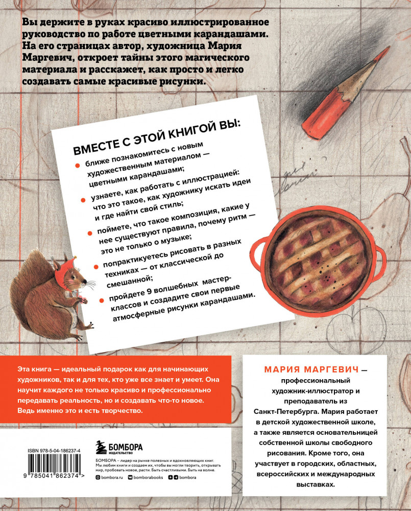 💳 Оплатить за товар можно при получении 🇰🇿 Есть бесплатная доставка по Казахстану от 1 дня 🎁 Копите бонусы с каждой покупки Серия: Начни рисовать. Лучшие книги для начинающих Материал из нашего детства — цветные карандаши. Профессиональная художница Мария Маргевич, которая уже успела покорить мир своими очаровательными, теплыми иллюстрациям, создала большое подарочное пособие, где делится секретами своего творчества. В этом руководстве Мария поделится секретами работы цветными карандашами — от всем известных техник до необычных приемов. Автор поговорит о поиске стиля и сюжета, а также покажет, как работать с цветом и подбирать красивые сочетания. Вместе с ней вы создадите свои первые работы цветными карандашами, а яркие красочные работы художницы погрузят вас в атмосферу магии и волшебства. |