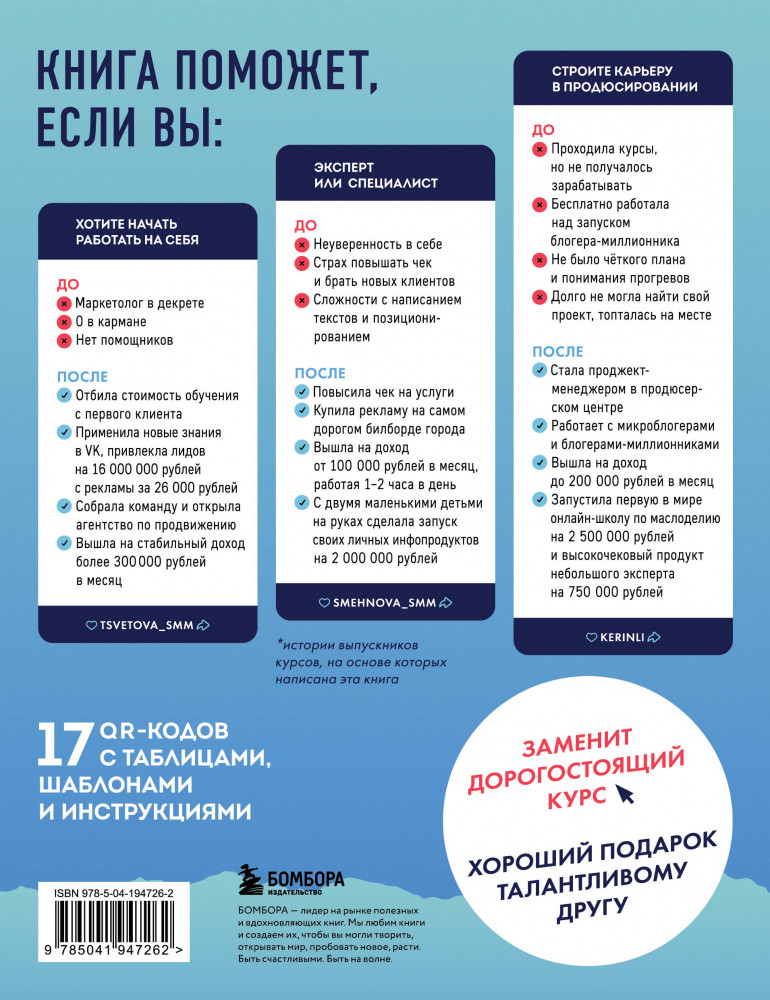 💳 Оплатить за товар можно при получении 🇰🇿 Есть бесплатная доставка по Казахстану от 1 дня 🎁 Копите бонусы с каждой покупки Серия: Маркетинг для немаркетологов Есть ли единая схема, которая позволяет делать многомиллионные запуски? Конечно, нет. Но есть проверенная стратегия создания и продаж инфопродуктов. Для блогов любого размера. С помощью этой стратегии Оля Сабылинская — пиарщик и один из основателей продюсерского центра с оборотом проектов более 1 миллиарда рублей — когда-то сделала запуск на 7,6 миллионов рублей в блоге с охватами 1124. А в своей новой книге «Запуски в лёгкости» она впервые показывает, как по этой же стратегии создаются известные инфопродукты, которые вы точно знаете и скорее всего покупали. |