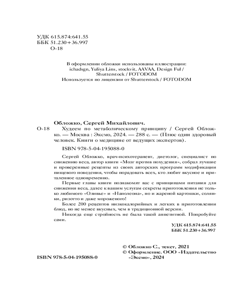 💳 Оплатить за товар можно при получении 🇰🇿 Есть бесплатная доставка по Казахстану от 1 дня 🎁 Копите бонусы с каждой покупки Серия: Плюс один здоровый человек. Книги о медицине от ведущих экспертов Книга рецептов от Сергея Обложко, врача-психотерапевта, диетолога, специалиста по снижению веса, автора книги «Мозг против похудения». К вашим услугам не только любимые «Оливье» и «Наполеон», но и жареная картошка, и солянка, и ризотто, и даже мороженое! Низкокалорийные и легкие в приготовлении, но не менее вкусные, чем в традиционной версии. И еще более 200 замечательных, вкусных и полезных рецептов. Никогда еще стройность не была такой вкусной. Попробуйте сами. |