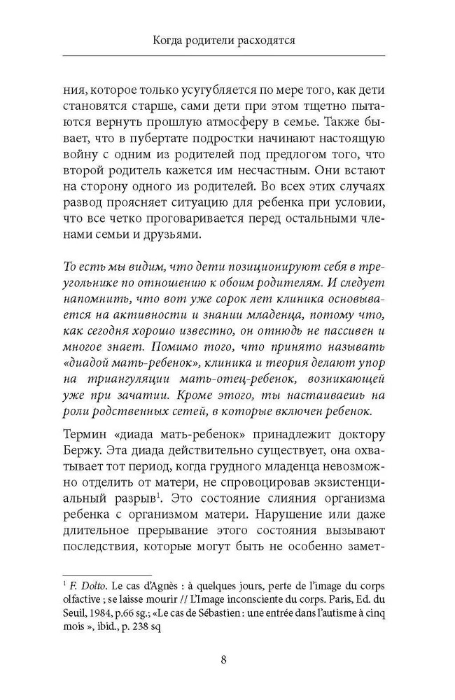 Когда родители расходятсяВ данный момент этот товар отсутствует в продаже. Возможно, у нас найдется аналогичный или похожий товар здесь. Эта книга не техническое эссе по психоанализу и в ней нет случаев из клинической практики: однако все, что я в ней говорю, основано на моем клиническом опыте. Родители, загубившие свой брак, иногда даже несколько браков подряд, вместе со мной могли анализировать возвращение вытесненного детского материала, связанного с разводом их собственных родителей и с молчанием, которым он обставлялся. Именно поэтому эта книга написана и для родителей, и для их детей. Она представлена в форме пространного интервью, часть которого посвящена всем тем, кто «отправляет правосудие» в различных «органах» институционального аппарата и за его рамками. |