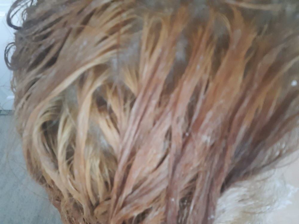 делала смывку из черного цвета, краской пользовалась корейской, красила года 2-3. Смешивала пудру 1:2 с 3% окислителем, дважды. Не жидкая, не пылится, без комочков, запаха нет. Волосы не отвалились, кожа пощипывала на второй раз, но терпимо. В блонд конечно же не вышла, грязно ржавый, пятнами получился, но такой эффект ожидался. Ещё надо дорабатывать до благородного цвета.