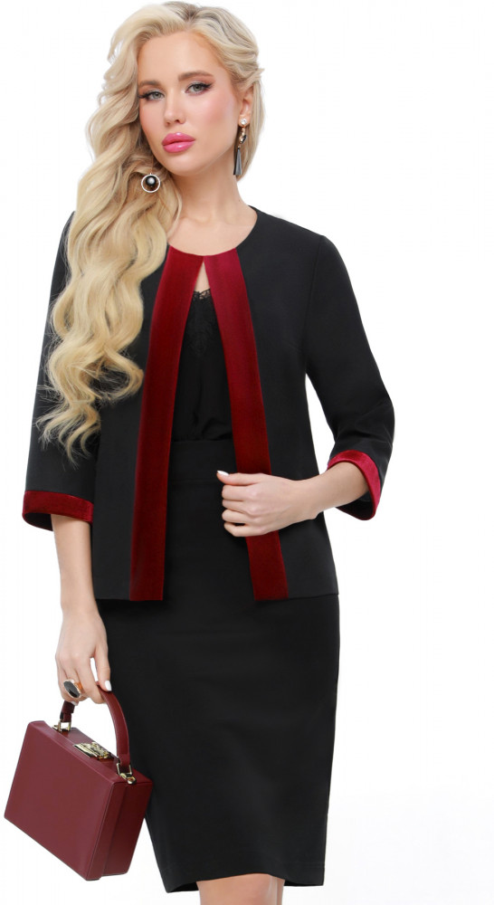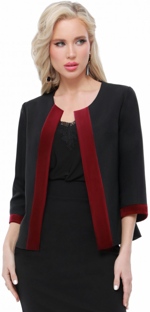 Жакет на мой ОГ=118 пришелся в пору. Смотрится не дешево, а если подобрать некричащую бижутерию, то будет великолепно смотреться и с брюками и с юбкой. Жакет без подклада.Отделка ни красная как написано сайте, а бордовая с фиолетовым отливом.Ткань синтетика.Я довольна!! Благодарю сайт за недорогие и интересные вещи.