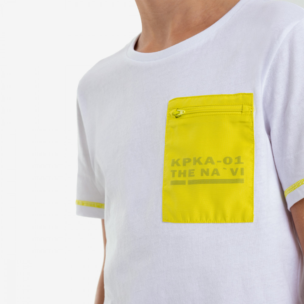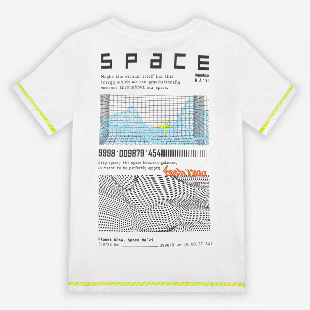 Футболка для мальчика выполнена из высококачественного хлопка и акцентирована контрастными швами. Горловина усилена рибом в тон изделия. Футболка имеет полупрозрачный функциональный кармашек на молнии с принтом на груди. По спинке футболка дополнена стильным принтом в космической тематике.