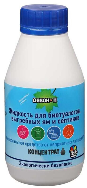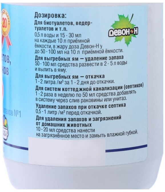 Средство «Девон-Н» — это универсальный уничтожитель запахов широкого спектра действия в виде жидкого концентрата. Жидкость «Девон-Н» быстро и эффективно устраняет запахи (фекальные, рвотные и пр.), не боится замерзания, не боится сливов моющих средств, способствует естественному биоразложению органических отходов с существенным уменьшением объёма. Хорошо разжижает фекальные массы в выгребных ямах и септиках.