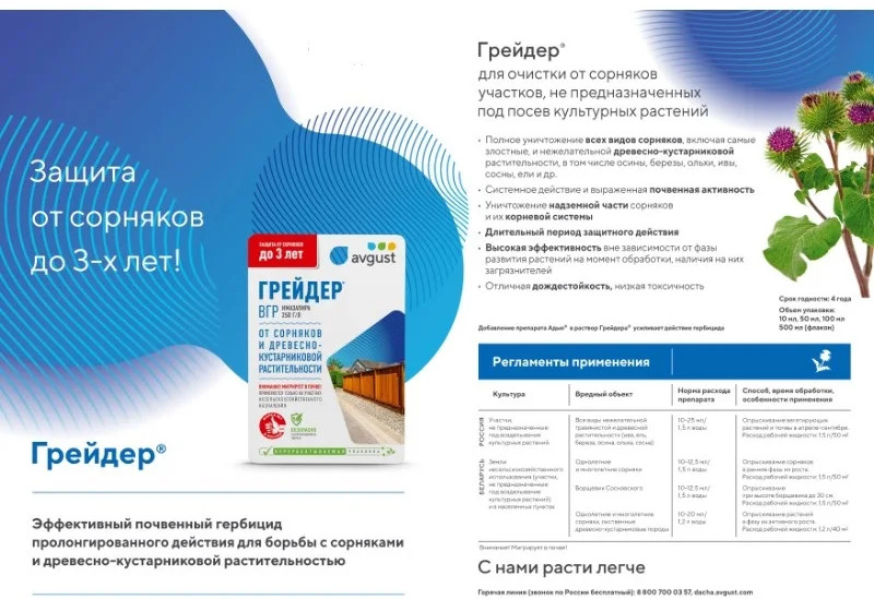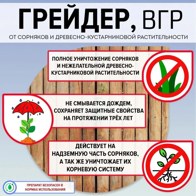 💳 Оплатить за товар можно при получении 🇰🇿 Есть бесплатная доставка по Казахстану от 1 дня 🎁 Копите бонусы с каждой покупки Грейдер — системный гербицид сплошного действия для уничтожения всех видов нежелательной травянистой и древесной растительности. Грейдер от древесной растительности (осина, береза, ольха), от одуванчика, борщевика, хмеля. Применяется на землях несельскохозяйственного назначения. |