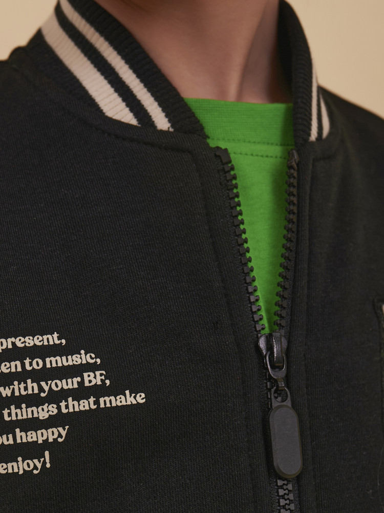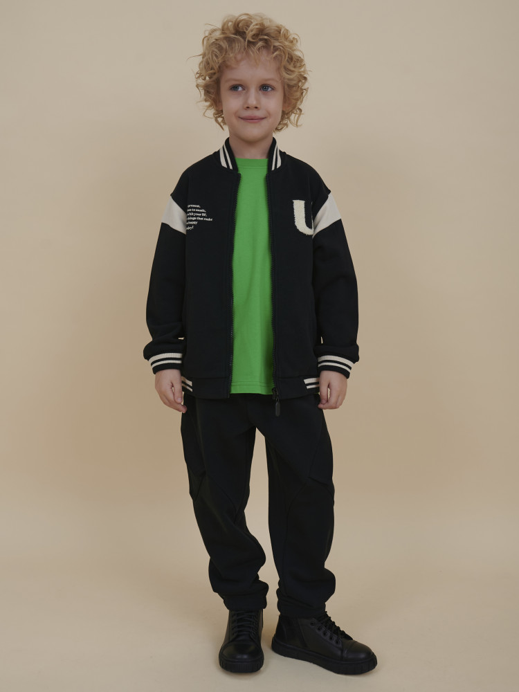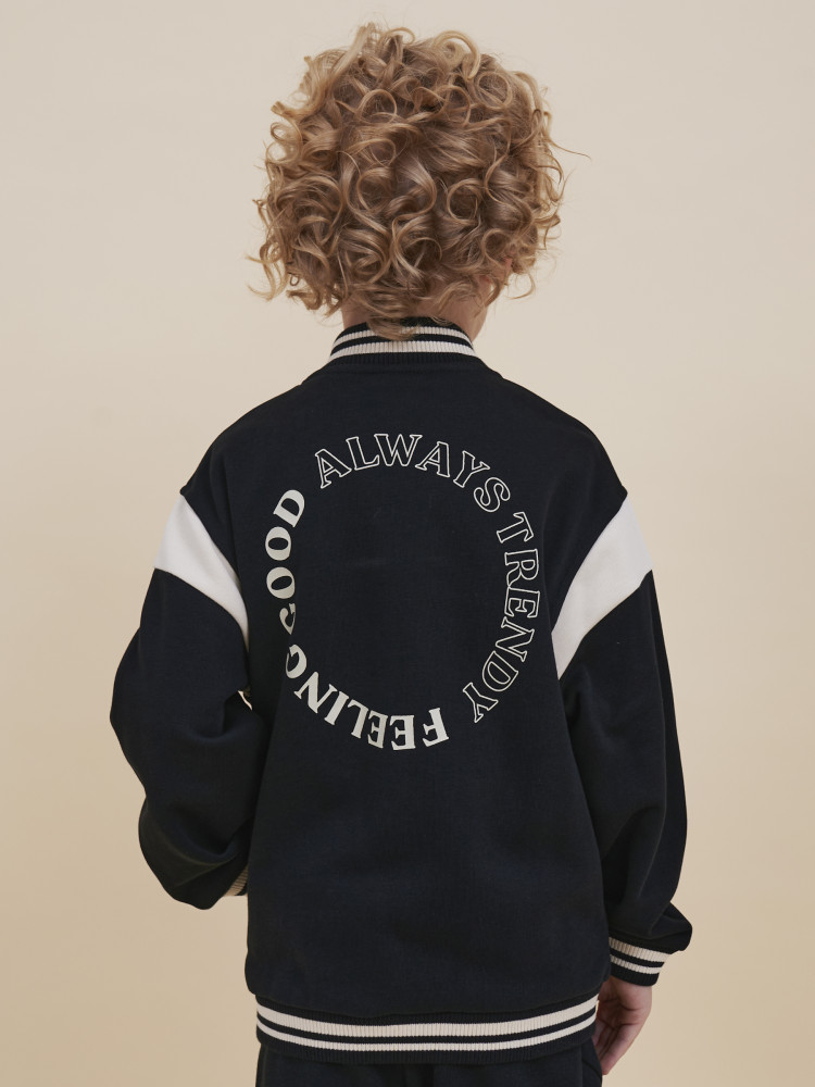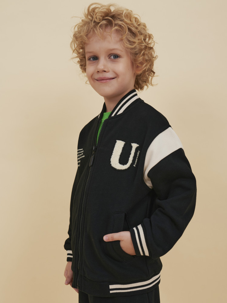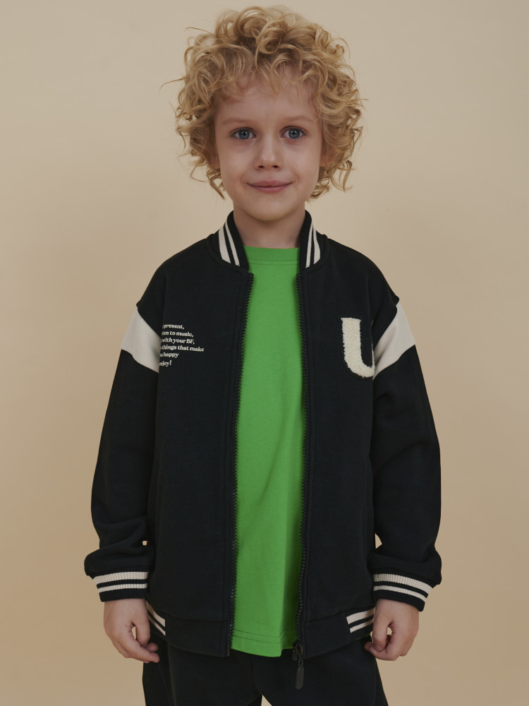Детский бомбер на центральной застежке молнии, со спущенным плечом и углубленной проймой. Воротник, манжеты по рукавам и низу изделия — из декоративного полосатого риба — стильная резинка в университетском стиле. На рукавах вставки из основного материала контрастного цвета. Боковые карманы с листочками расположены на переде под наклоном. Детский жакет для мальчика украшен модным университетским шрифтом с засечками. Перед декорирован нашивкой — объемной мягкой аппликацией из бербер-флиса (барашек) и графичной шрифтовой композицией. Меховая нашивка буквой «U»: unity — перевод «единство, командная сплоченность». Надпись: «Be present, listen to music, be with you BF, do things that make you happy #enjoy!» — перевод «Живи в моменте, слушай музыку, встречайся со своим лучшим другом, делай то, что делает тебя счастливым #наслаждайся!». На спине круговая шрифтовая композиция: «Feeling good always trendy» — перевод «Хорошее настроение всегда в тренде (модно)».