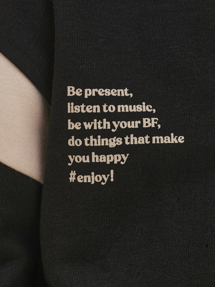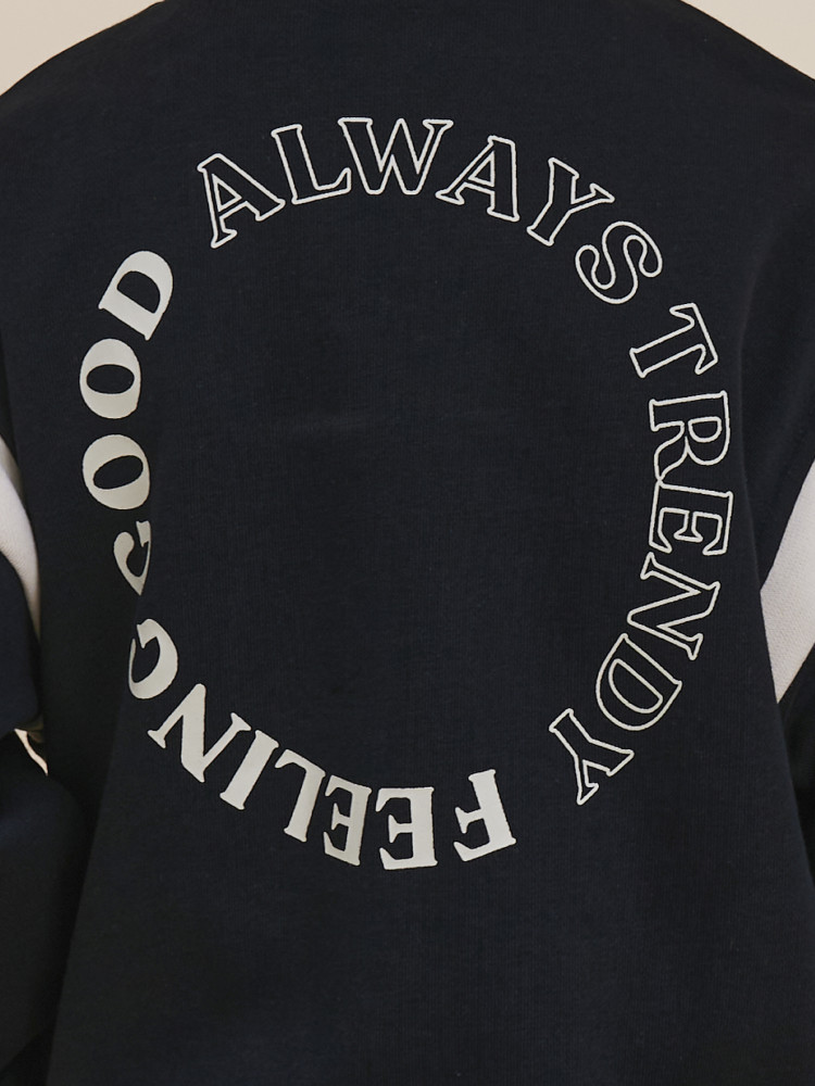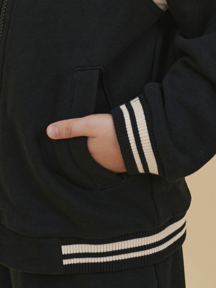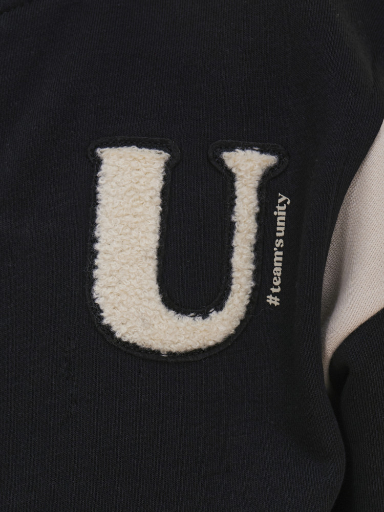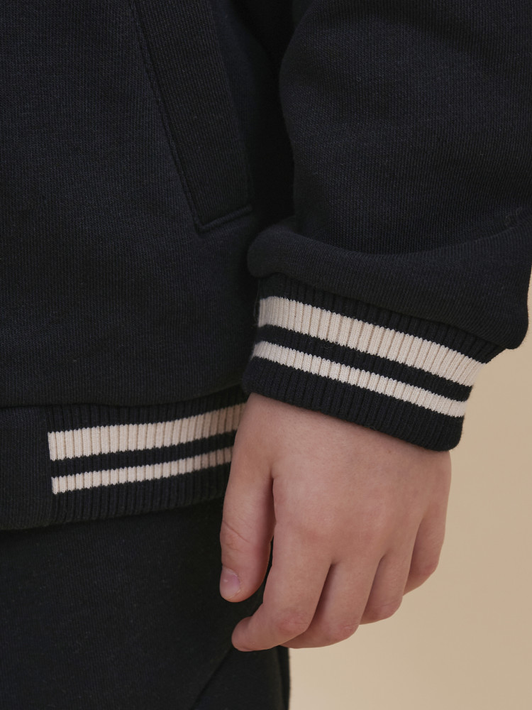 Детский бомбер на центральной застежке молнии, со спущенным плечом и углубленной проймой. Воротник, манжеты по рукавам и низу изделия — из декоративного полосатого риба — стильная резинка в университетском стиле. На рукавах вставки из основного материала контрастного цвета. Боковые карманы с листочками расположены на переде под наклоном. Детский жакет для мальчика украшен модным университетским шрифтом с засечками. Перед декорирован нашивкой — объемной мягкой аппликацией из бербер-флиса (барашек) и графичной шрифтовой композицией. Меховая нашивка буквой «U»: unity — перевод «единство, командная сплоченность». Надпись: «Be present, listen to music, be with you BF, do things that make you happy #enjoy!» — перевод «Живи в моменте, слушай музыку, встречайся со своим лучшим другом, делай то, что делает тебя счастливым #наслаждайся!». На спине круговая шрифтовая композиция: «Feeling good always trendy» — перевод «Хорошее настроение всегда в тренде (модно)».