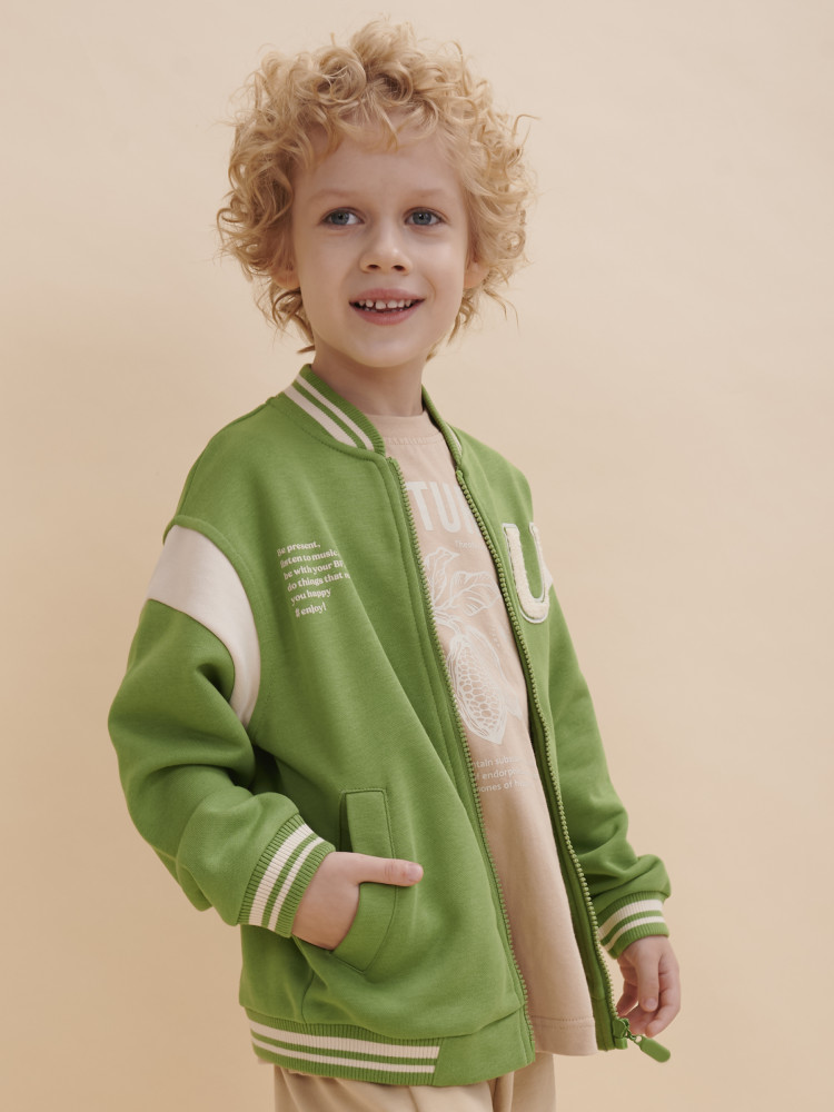 Модный жакет-бомбер для мальчика — трикотажная модель свободного кроя на позднюю весну, лето. Уютная вещь для создания стильного образа, которую легко сочетать с любым низом, использовать для многослойных образов. Идеальна в качестве плотной кофты для прохладного помещения. Трикотажная куртка выполнена из смесовой ткани с высоким содержанием хлопка и небольшим добавлением полиэстера. Материал хорошо пропускает воздух, обеспечивает здоровую гигроскопичность. Ребенок не потеет и комфортно чувствует себя во время активных игр и занятий спортом. Наличие полиэстера наделяет жакет для мальчика повышенной износоустойчивостью к усадке, защитой от образования катышек. Изделие не линяет после стирки и сохраняет красивый внешний вид.