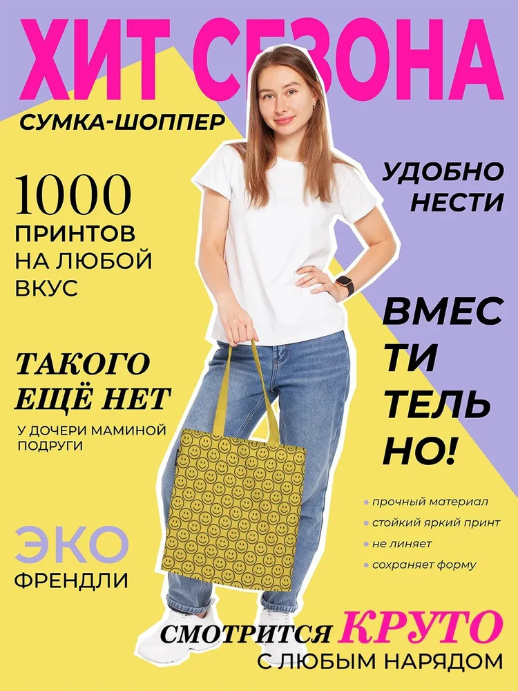 💳 Оплатить за товар можно при получении 🇰🇿 Есть бесплатная доставка по Казахстану от 1 дня 🎁 Копите бонусы с каждой покупки Серия: Яркие смайлы Текстильный шоппер с принтом станет для вас незаменимым хозяйственным аксессуаром. Сумка изготовлена из высококачественной и износостойкой ткани «Оксфорд» плотностью 200 гр/кв.м. на основе волокон 100% полиэстера с водоотталкивающей пропиткой. |