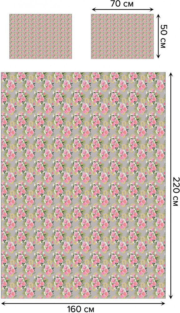 Комплектация: покрывало 160 × 220 см (1,5-спальное), наволочки 50 × 70 см — 2 шт.