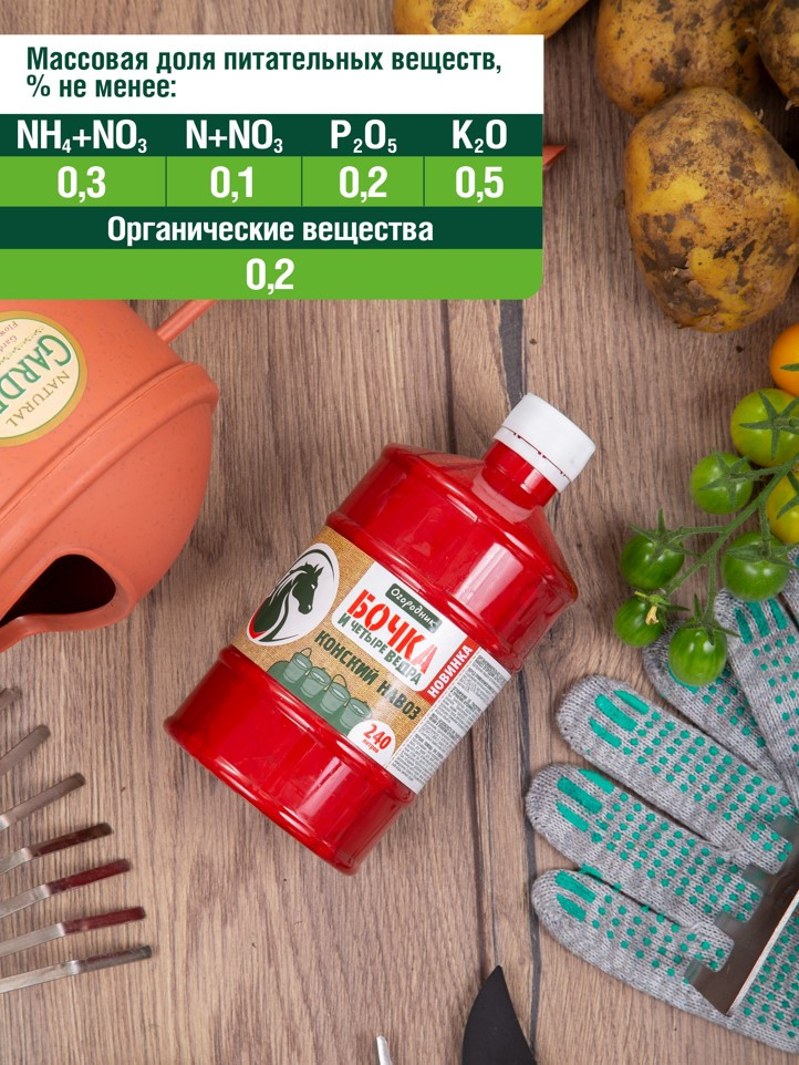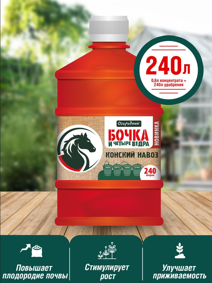 Огородник Удобрение органоминеральное «Конский навоз»В данный момент этот товар отсутствует в продаже. Возможно, у нас найдется аналогичный или похожий товар здесь. Серия: Бочка и четыре ведра Конский навоз является одним из лидеров по содержанию питательных элементов среди органических удобрений, а компосты на его основе входят в число наиболее ценных продуктов. В сравнении с куриным пометом удобрения на его основе отличаются более мягким действием на растения и прекрасно подходят для подкормки растений в весенний, летний и осенний период. Удобрение «Бочка и четыре ведра конский навоз» представляет собой органоминеральный комплекс, в котором конский навоз сочетается с минеральными элементами питания в результате чего эффективность проводимых подкормок значительно увеличивается. При этом, использование компоста в жидкой форме позволяет равномерно вносить в почву удобрение и оперативно доставить его в корневую зону растения, сокращая время между использованием удобрения и его непосредственным эффектом. |