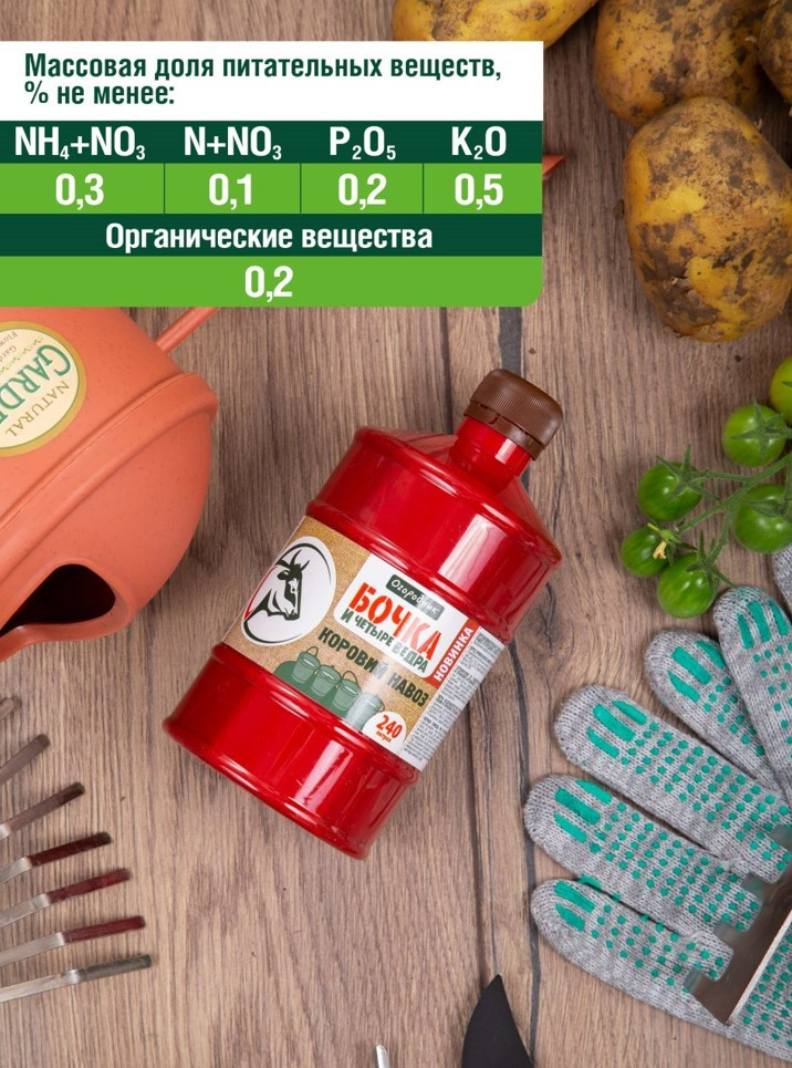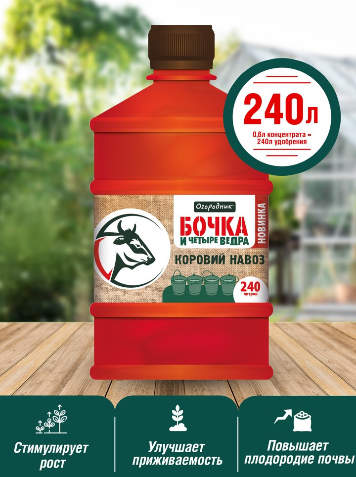 Огородник Удобрение органоминеральное «Коровий навоз»В данный момент этот товар отсутствует в продаже. Возможно, у нас найдется аналогичный или похожий товар здесь. Серия: Бочка и четыре ведра Коровий навоз наряду с куриным пометом является одним из наиболее популярных органических удобрений для подкормки растений. В сравнении с куриным пометом, коровяк характеризуется более медленным усвоением, в результате чего длительность его действия увеличивается, а в сочетании с минеральными элементами, которые входят в состав удобрения «Бочка и четыре ведра коровий навоз», также растут и положительные эффекты — укрепляется иммунитет и устойчивость растений к неблагоприятным факторам, улучшаются эстетические характеристики цветочных и декоративно-лиственных видов, а также формируются более сочные и крупные плоды у плодово-ягодных растений. Положительное влияние органическое вещество оказывает и на состав почвенной микрофлоры, поддерживая её разнообразие, которое критически важно для сохранения плодородия почв. |