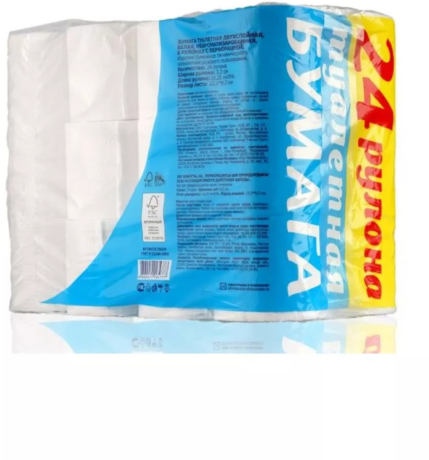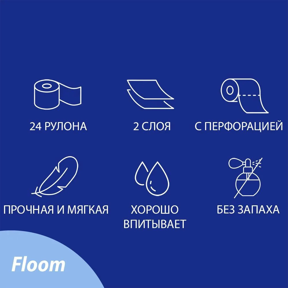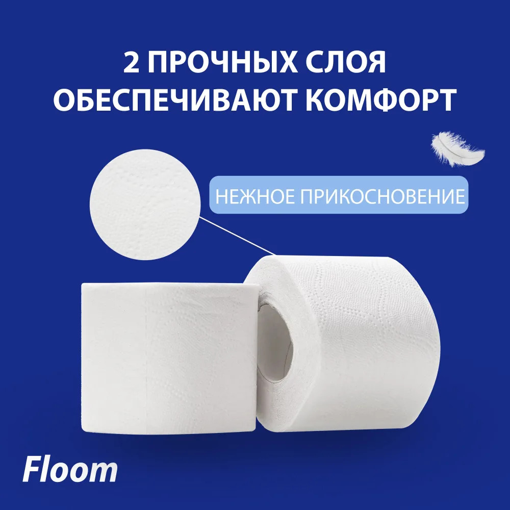 Бумага туалетная двухслойная Floom, белая, не ароматизированная, в рулонах с перфорацией. Изделие бумажное гигиенического назначения разового пользования. Бумага выполнена из вторичной целлюлозы. |