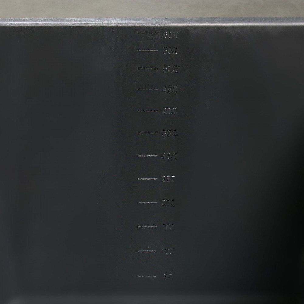 Есть мерная шкала. Гладкие швы, что позволит передвинуть емкость без перчаток.