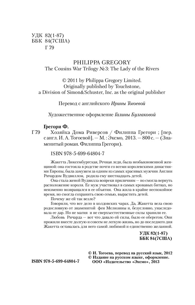 В данный момент этот товар отсутствует в продаже. Возможно, у нас найдется аналогичный или похожий товар здесь. Серия: Знаменитый роман. Филиппа Грегори (обложка) Жакетта Люксембургская, Речная леди, была необыкновенной женщиной: она состояла в родстве почти со всеми королевскими династиями Европы, была замужем за одним из самых красивых мужчин Англии Ричардом Вудвиллом, родила ему шестнадцать детей.