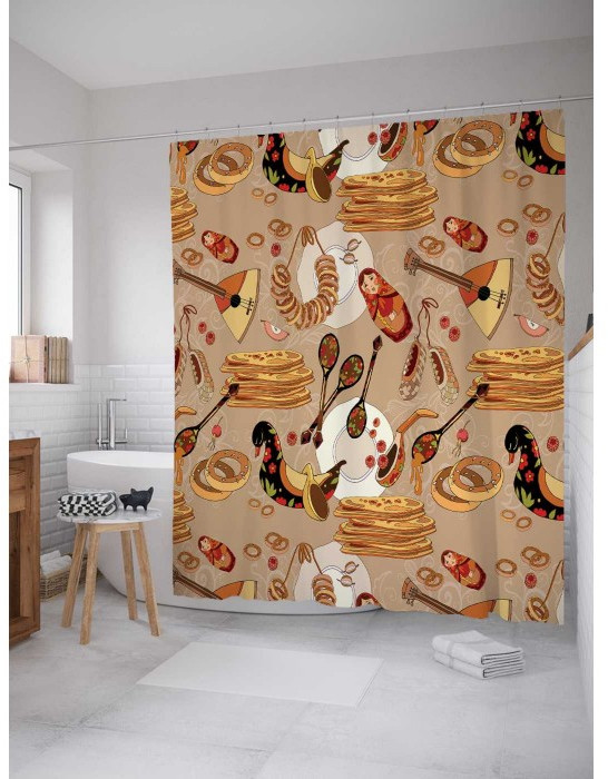 Отверстия под крючки не имеют люверсов/утяжелителей и обработаны оверлоком. Современная текстильная штора для душа комплектуется 12 крючками-кольцами из пластика, предназначенных для штанги и карниза. Рисунок нанесен на внешнюю сторону изделия с помощью сублимационной печати. Такие принты не боятся влаги, не смываются под горячей водой и не потускнеют со временем. Обратная сторона изделия — белая.