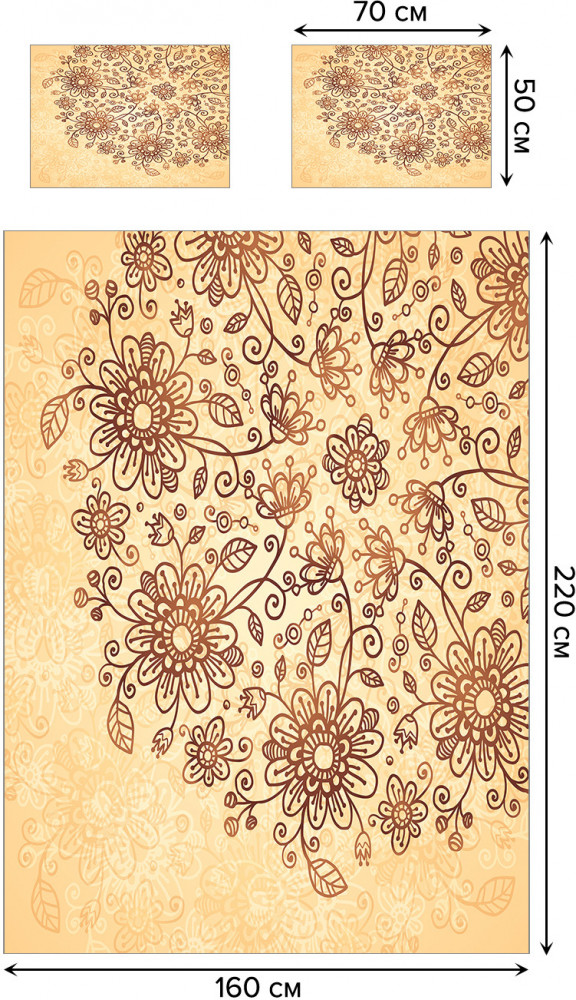 Комплектация: покрывало 160 × 220 см (1,5-спальное), наволочки 50 × 70 см — 2 шт.