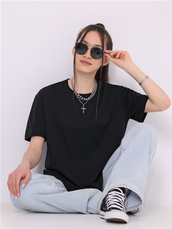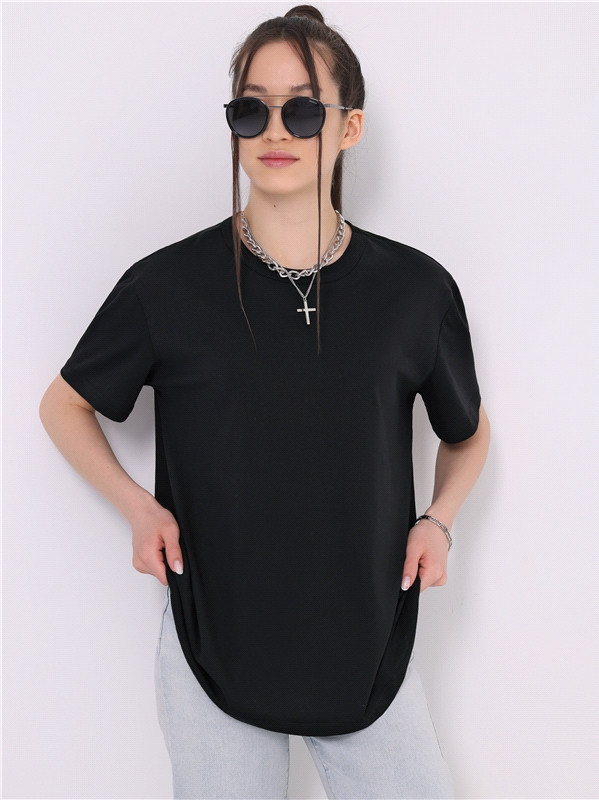 Заказывала 48 разм.,но оказалась большая . Футболка длинная,заканчивается на середине бедра,плечевые швы ниже плеча.Я думаю на 50 р.или даже на 52 р.будет хорошо смотреться.
