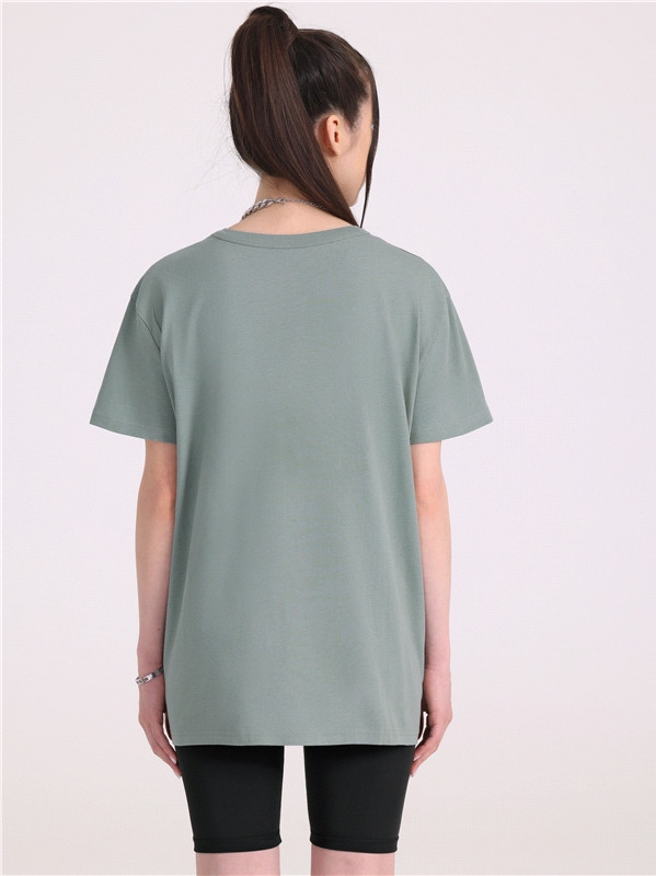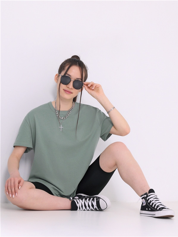Заказывала 48 разм.,но оказалась большая . Футболка длинная,заканчивается на середине бедра,плечевые швы ниже плеча.Я думаю на 50 р.или даже на 52 р.будет хорошо смотреться.