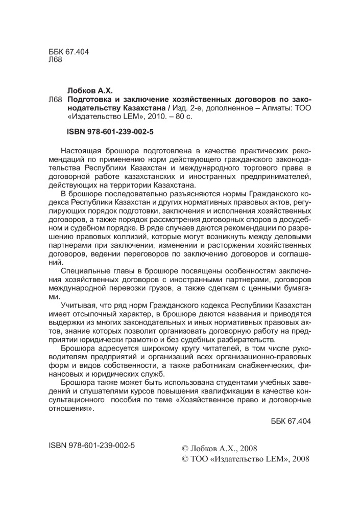 💳 Оплатить за товар можно при получении 🇰🇿 Есть бесплатная доставка по Казахстану от 1 дня 🎁 Копите бонусы с каждой покупки Настоящая брошюра подготовлена в качестве практических рекомендаций по применению норм действующего гражданского законодательства Республики Казахстан и международного торгового права в договорной работе казахстанских и иностранных предпринимателей действующих на территории Казахстана. |