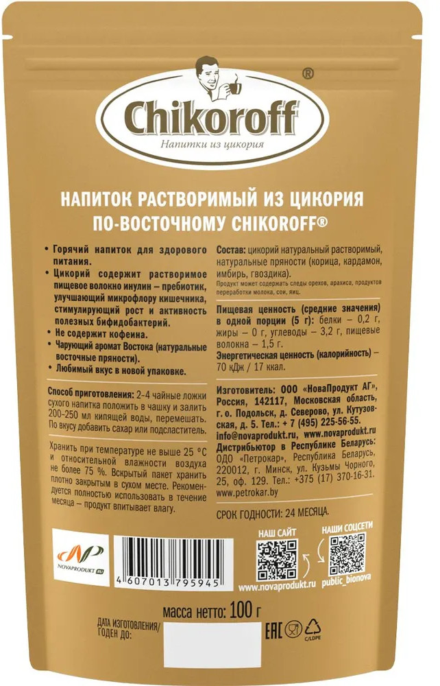 Всегда брали обычный цикорий Chikoroff. На наш вкус это самый мягкий и вкусный из всех других, которые мы пробовали (пьём всей семьёй). Попробовали новый цикорий "по-восточному". Он очень необычный. На упаковке так и не нашла точный состав (написано пряности). Чувствуются корица, гвоздика, может быть кардамон. Для меня это оооочень вкусный, яркий аромат. С молоком (особенно когда взбиваю его капучинатором) и сахаром получается такой вкусный напиток, что ни в одной кофейне такое не сделают))) Спасибо производителю и Флип! В магазинах нашего города этого цикория нет.