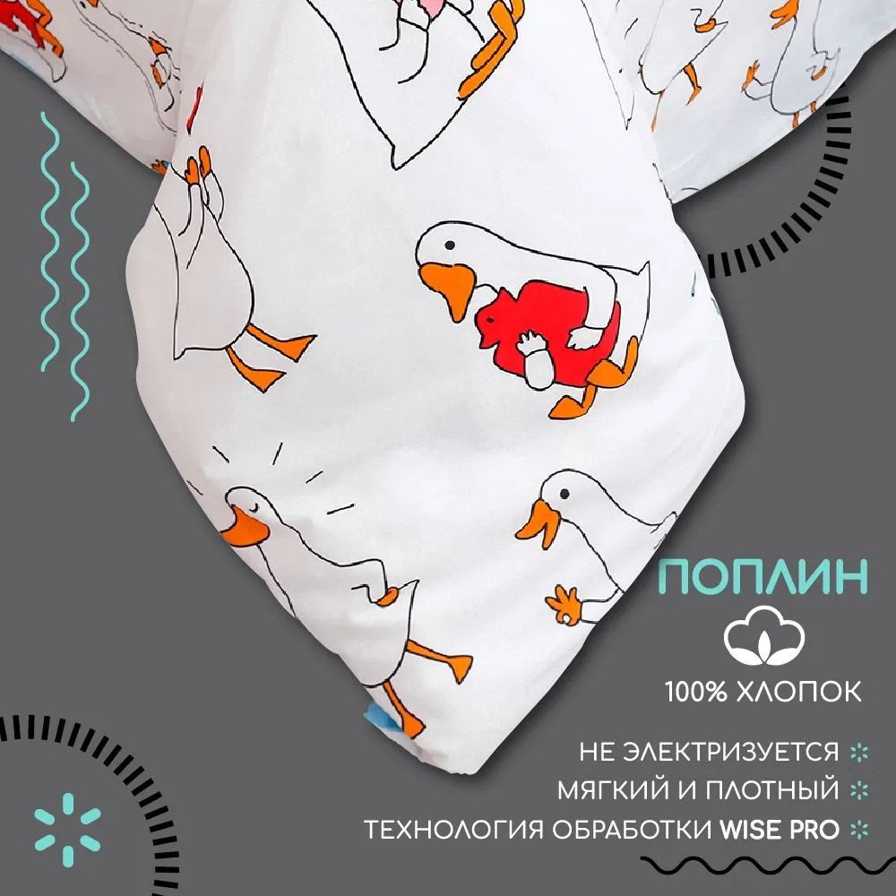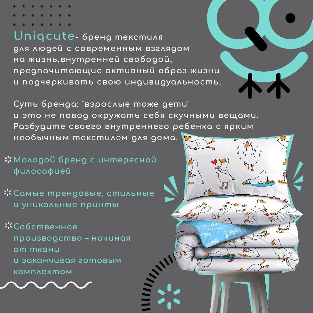 Взрослая жизнь — совсем не повод окружать себя скучными однотонными вещами. Разбудите своего внутреннего ребенка с ярким, милым и необычным постельным бельем Unicqute. Стильные и забавные принты, неожиданные расцветки и море комфорта заставят вас засыпать и просыпаться с улыбкой, видеть красоту в мелочах и наслаждаться каждым мгновением нового дня. Постельное белье выполнено из поплина. Ткань из 100% натурального хлопкового волокна отличается гипоаллергенностью, гигиеничностью, износостойкостью. Она приятна к телу, отлично пропускает воздух, не электризуется. За поплиновым бельем очень легко ухаживать. Оно не теряет яркости и не деформируется при стирке с температурой до 40°С.