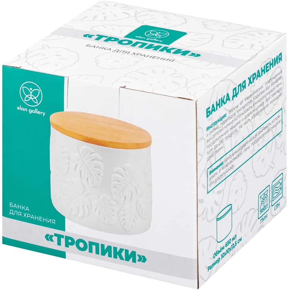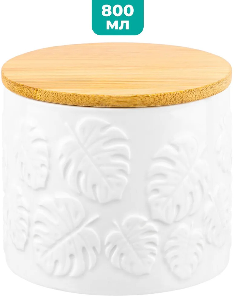 Банка для сыпучих продуктов «Тропики» выполнена из белого фарфора и украшена рельефными узорами в виде листьев. Баночка имеет крышку из натурального бамбука с силиконовым уплотнителем. Фарфоровая ёмкость станет удобным и эстетичным дополнением вашей кухни. Банка для сыпучих продуктов позволит не просто хранить чай, кофе и сахар на вашей кухне, но и станет элементом её декора. Кухонная баночка подойдёт к интерьеру в любом стиле. Не рекомендуется применять абразивные моющие средства. Бамбуковые детали нельзя замачивать. Банка для сыпучих продуктов станет настоящим украшением кухни или приятным подарком для ваших родных и близких!