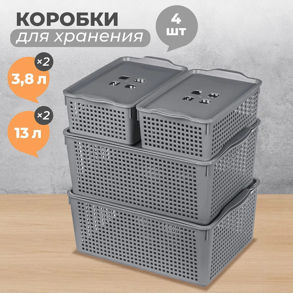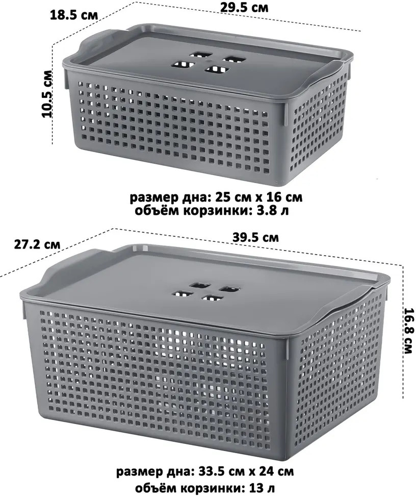 • корзина с крышкой объемом 13 литров (размер 39,5×27,2×16,8 см, дно 33,5×24 см) — 2 шт.