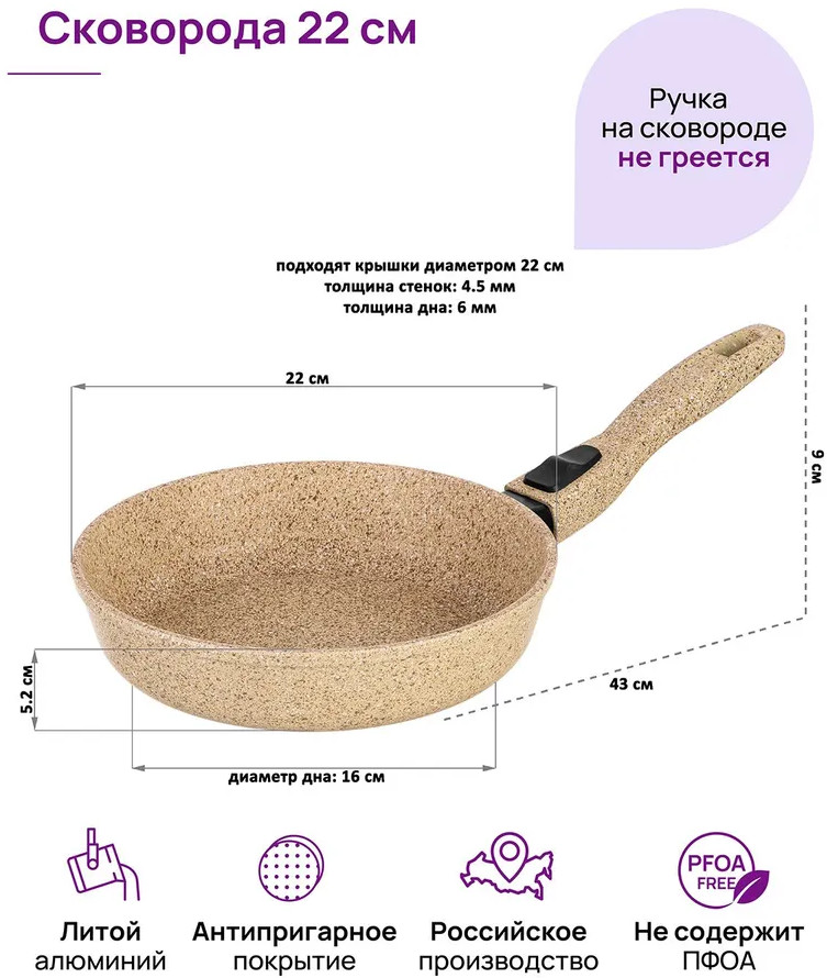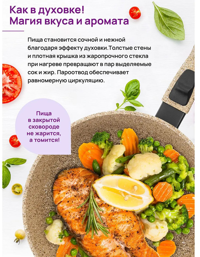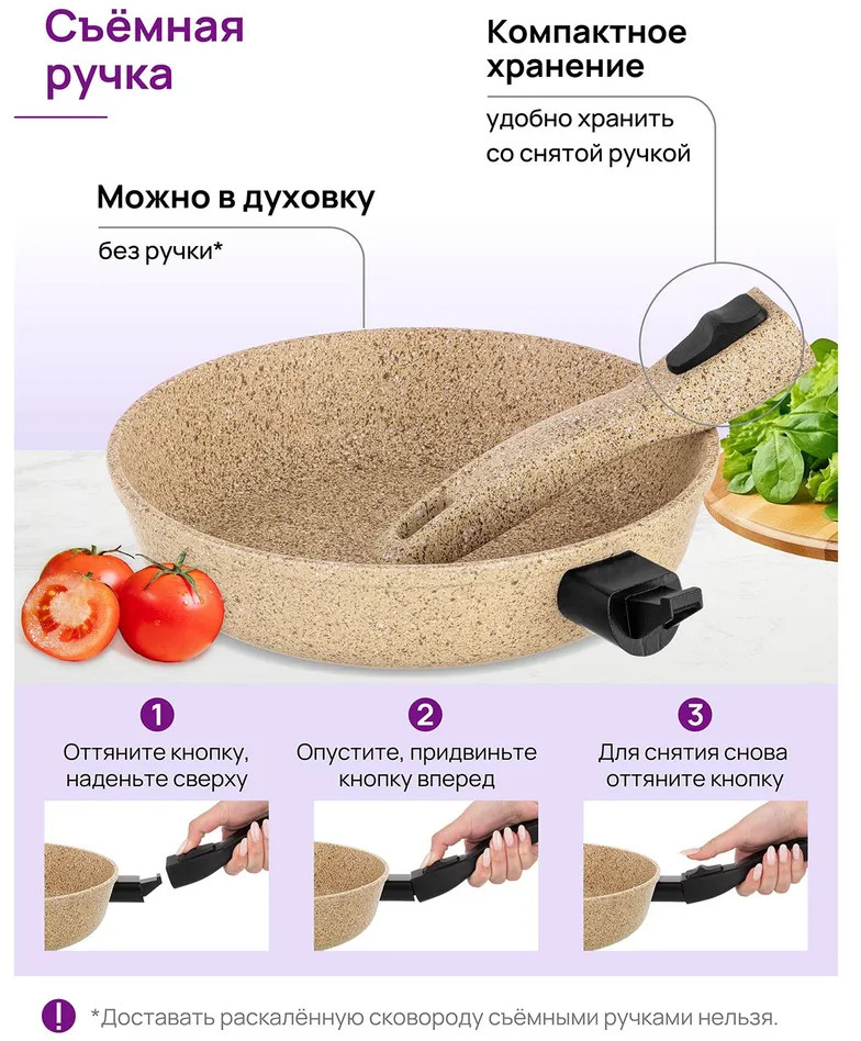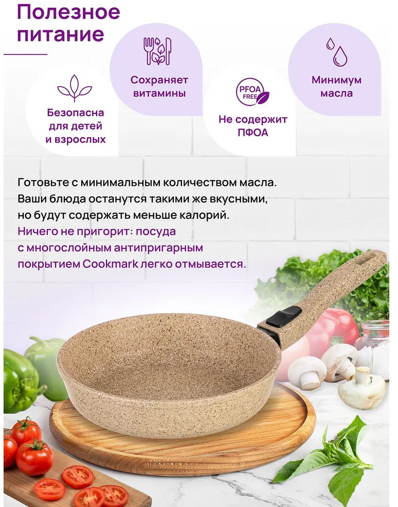 Глубокая сковорода со съёмной ручкой равномерно разогревается и распределяет тепло таким образом, что продукты в ней сохраняют свои полезные свойства, сочность и вкус. Стильный дизайн, имитирующий гранит, подойдет к любому интерьеру вашей кухни. Сковорода с глубоким дном выполнена из толстостенного литого алюминия и имеет ультрапрочное двухслойное антипригарное покрытие Cookmark. Оно устойчиво к царапинам и износу, полностью безопасно для здоровья и не содержит PFOA или других вредных веществ. Сковороду можно использовать для жарки с минимальным количеством масла для приготовления здоровой пищи, что оценит любой гурман.