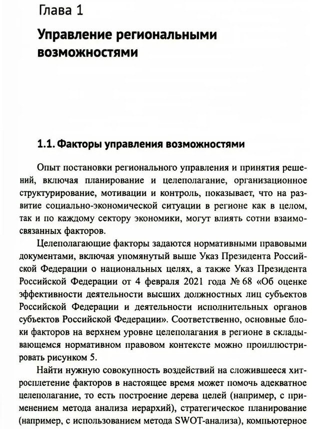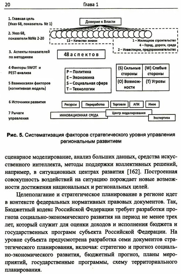 Первая глава посвящена подходам к управлению региональными возможностями в контексте классической структуры постановки государственного менеджмента, включая планирование, организацию, мотивацию и контроль. Приводится вариант рассмотрения региона как комплексного объекта управления. Вторая глава посвящена стратегическому планированию социально-экономического развития региона с применением методов когнитивного моделирования, анализа иерархий, оценки рисков, искусственного интеллекта. Третья глава обобщает опыт сценарного моделирования, оценки и выбора приоритетных сценариев социально-экономического развития региона, включая отраслевую специфику (например, сельское хозяйство), социальную безопасность, кадровый потенциал и др. В четвертой главе приводится методика анализа и оптимизации организационной структуры администрации региона с учетом стратегических приоритетов развития; рассматриваются вопросы мотивации. Пятая глава содержит модели оценки актуальных экономических показателей региона и выявления точек опоры и развития.