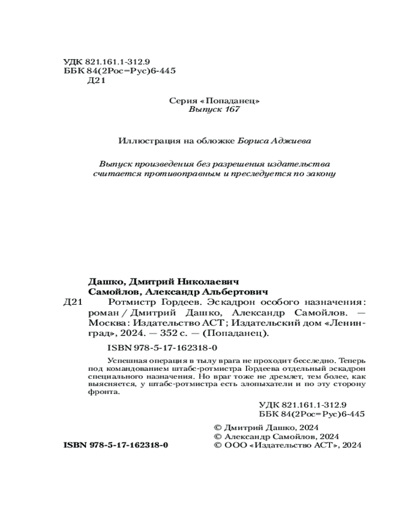 💳 Оплатить за товар можно при получении 🇰🇿 Есть бесплатная доставка по Казахстану от 1 дня 🎁 Копите бонусы с каждой покупки Серия: Попаданец Успешная операция в тылу врага не проходит бесследно. Теперь под командованием штабс-ротмистра Гордеева отдельный эскадрон специального назначения. Но враг тоже не дремлет, тем более, как выясняется, у штабс-ротмистра есть злопыхатели и по эту сторону фронта. |