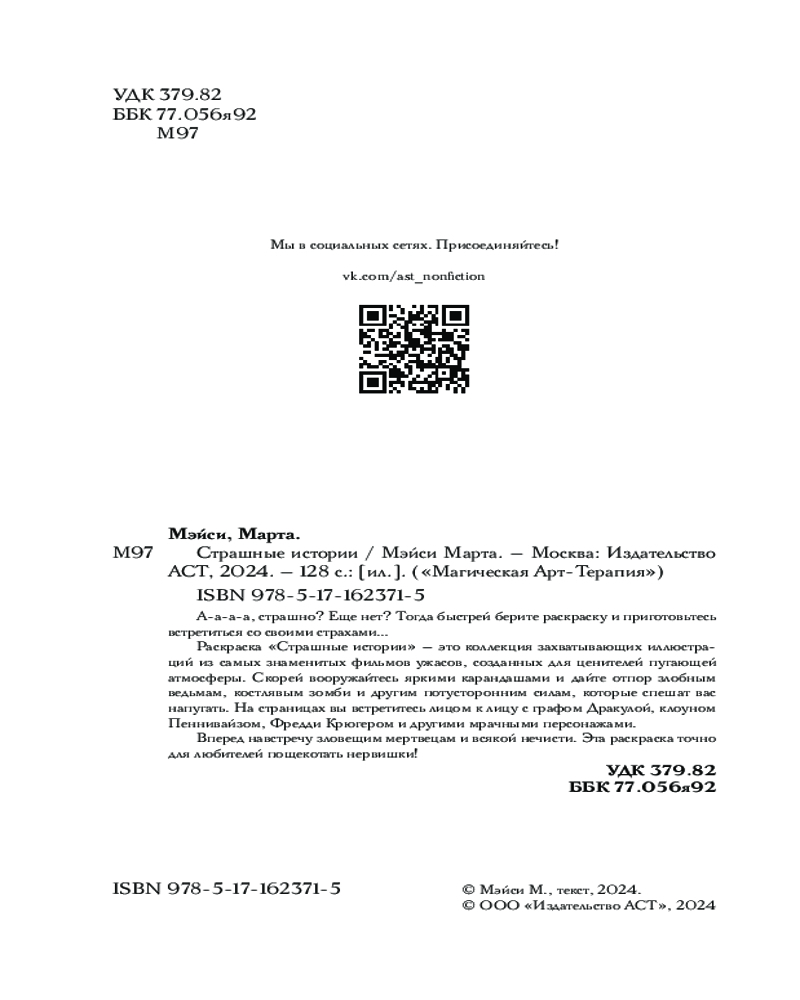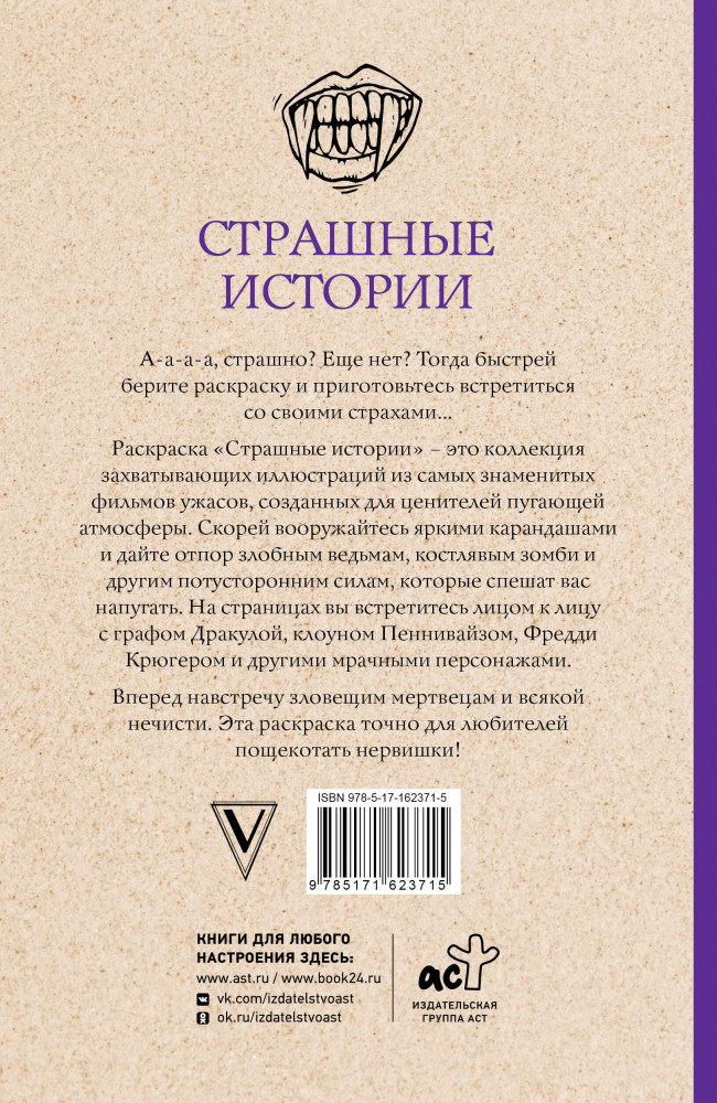 💳 Оплатить за товар можно при получении 🇰🇿 Есть бесплатная доставка по Казахстану от 1 дня 🎁 Копите бонусы с каждой покупки Серия: Магическая Арт-Терапия А-а-а-а, страшно? Еще нет? Тогда быстрей берите раскраску и приготовьтесь встретиться со своими страхами... Раскраска «Страшные истории» — это коллекция захватывающих иллюстраций из самых знаменитых фильмов ужасов, созданных для ценителей пугающей атмосферы. Скорей вооружайтесь яркими карандашами и дайте отпор злобным ведьмам, костлявым зомби и другим потусторонним силам, которые спешат вас напугать. На страницах вы встретитесь лицом к лицу с графом Дракулой, клоуном Пеннивайзом, Фредди Крюгером и другими мрачными персонажами. Вперед навстречу зловещим мертвецам и всякой нечисти. Эта раскраска точно для любителей пощекотать нервишки! |