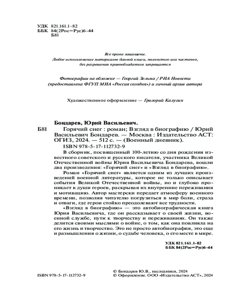 💳 Оплатить за товар можно при получении 🇰🇿 Есть бесплатная доставка по Казахстану 🎁 Копите бонусы с каждой покупки Серия: Военный дневник В сборник, посвященный 100-летию со дня рождения известного советского и русского писателя, участника Великой Отечественной войны Юрия Васильевича Бондарева, вошли два произведения: «Горячий снег» и «Взгляд в биографию». |