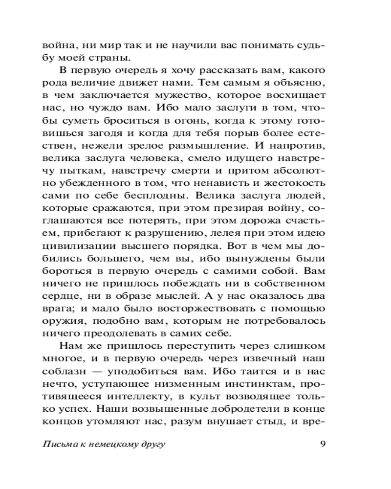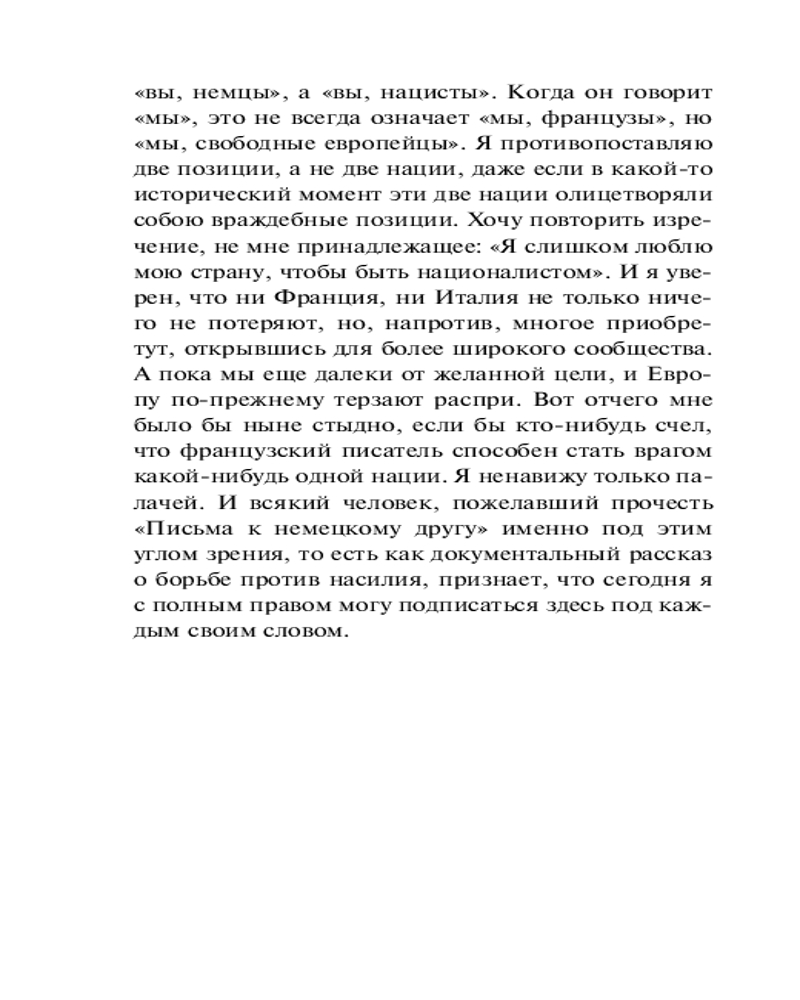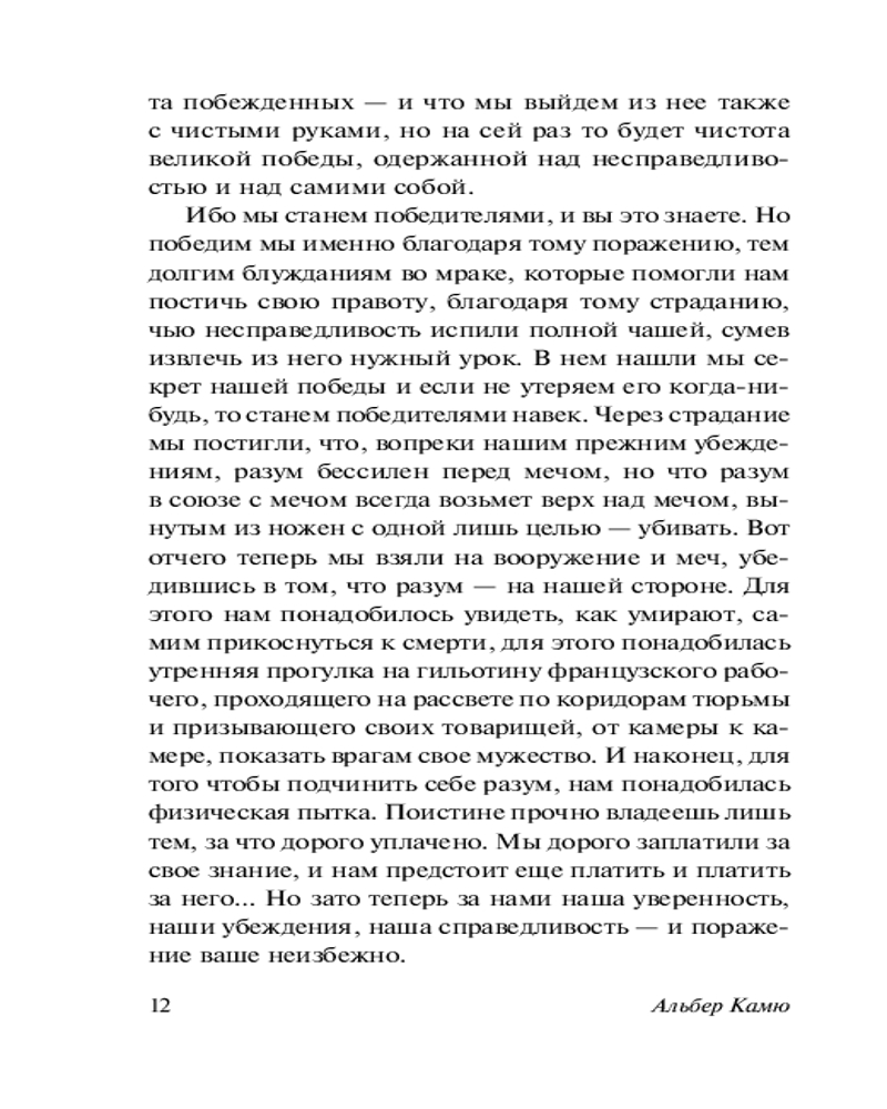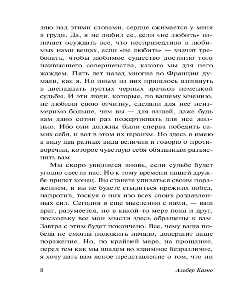 В книге (сборнике) 4 сильнейших произведения Альбера Камю. Письма к немецкому другу пропитаны французскими нравами, "Мы, французы, требовательны к своей отчизне!". Лично я узнал, что довольно долгое время французы вообще не оказывали сопротивления нацисткой оккупации, и лишь когда они точно поняли, что они на правильной стороне истории и конфликта, то всё началось. Друг обвиняет Альбера Камю в отсутствии патриотизма, Альбер Камю 40 страниц рассказывает о том, какой его патриотизм... Имеет высокое нравственное начало, так сказать. Размышления о гильотине (основное произведение) безумно затягивают. Лучше это читать вслух. Громко и выразительно! Описать трудно, это надо прочитать! А речь на нобелевской премии за литературу... Невероятные слова, не просто так его прозвали "Совестью Запада"! Простыми "да" и "нет" я оценю эту книга: Да, да и еще раз да.
