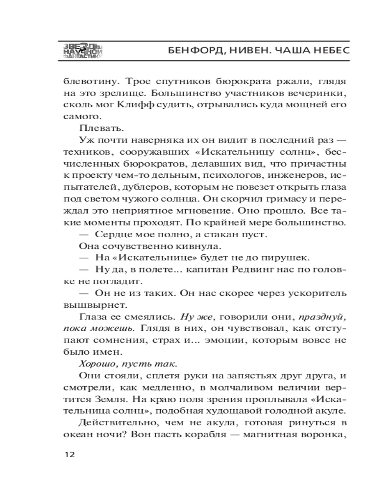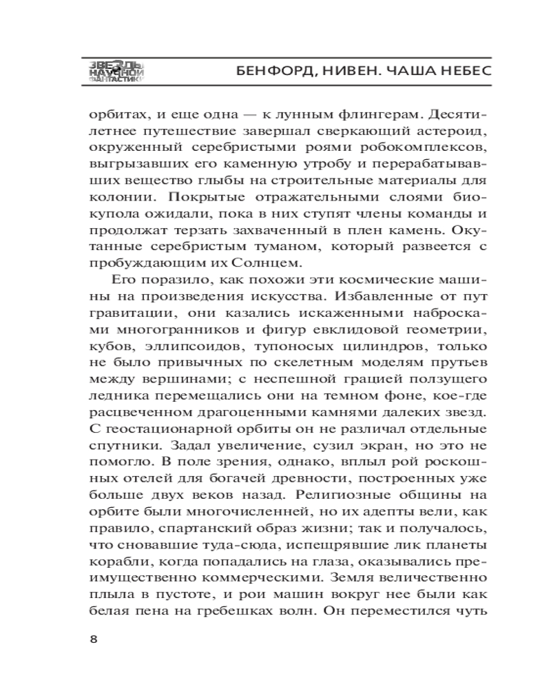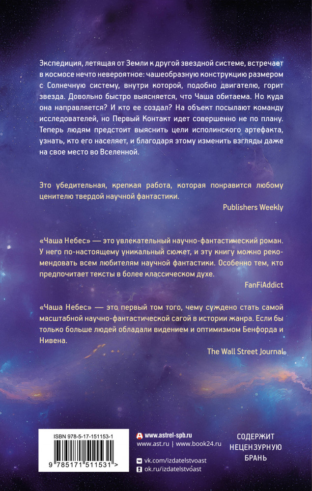 💳 Оплатить за товар можно при получении 🇰🇿 Есть бесплатная доставка по Казахстану 🎁 Копите бонусы с каждой покупки Серия: Звезды научной фантастики Экспедиция, летящая от Земли к другой звездной системе, встречает в космосе нечто невероятное: чашеобразную конструкцию размером с Солнечную систему, внутри которой, подобно двигателю, горит звезда. Довольно быстро выясняется, что Чаша обитаема. Но куда она направляется? И кто ее создал? На объект посылают команду исследователей, но Первый Контакт идет совершенно не по плану. Теперь людям предстоит выяснить цели исполинского артефакта, узнать, кто его населяет, и благодаря этому изменить взгляды даже на свое место во Вселенной. |