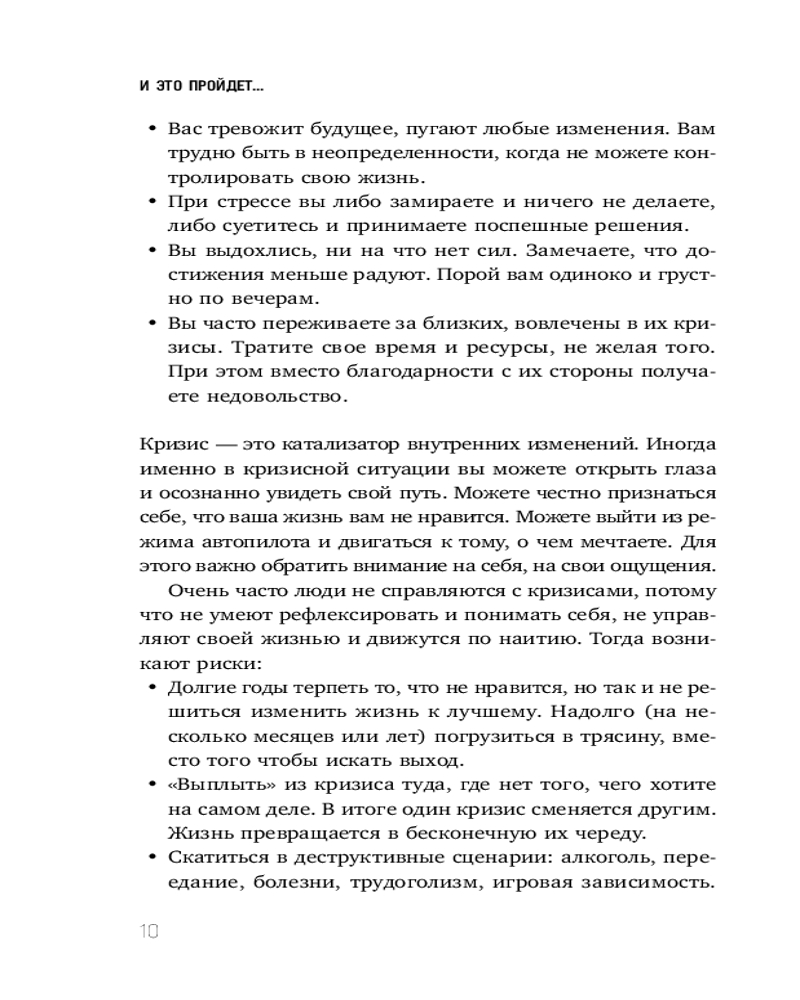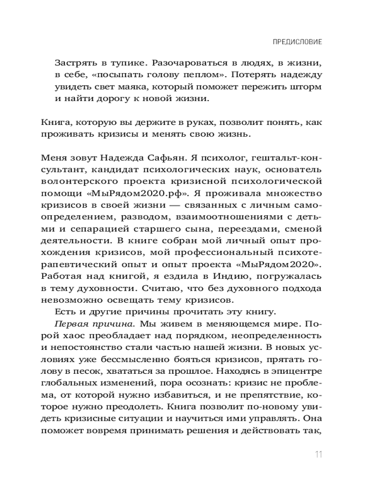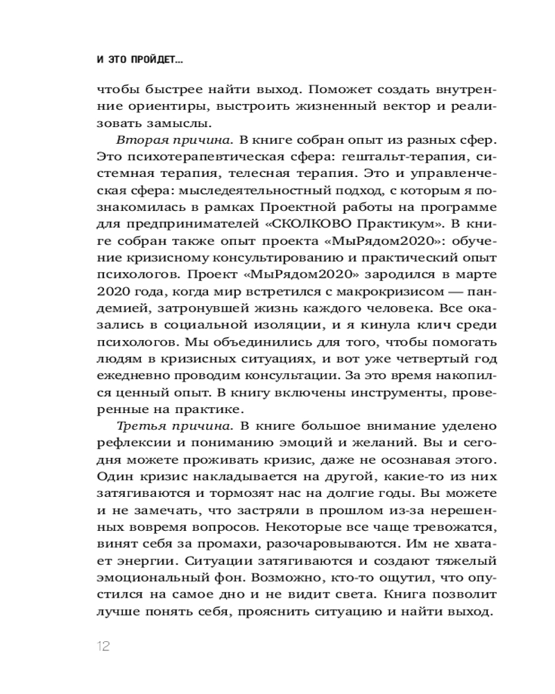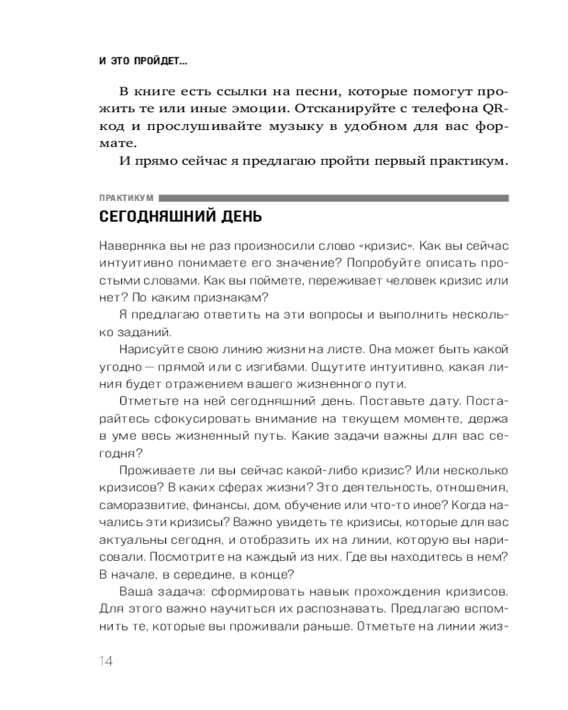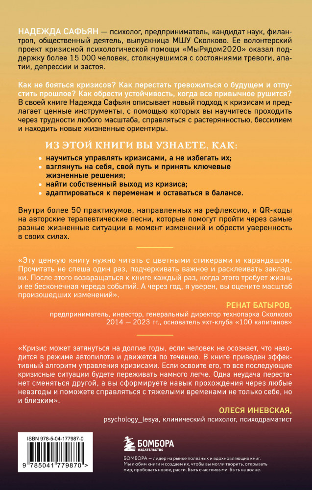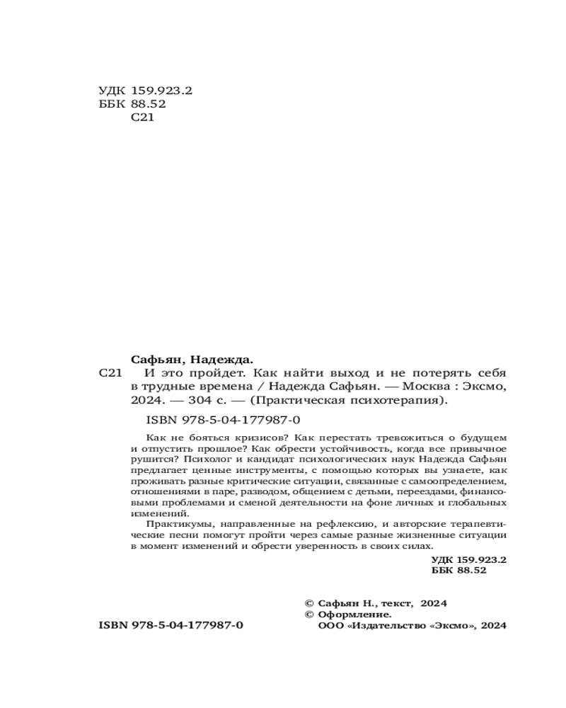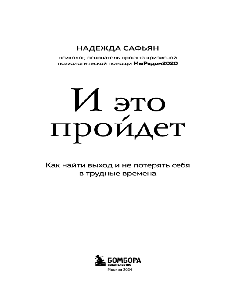 И это пройдёт. Как найти выход и не потерять себя в трудные временаВ данный момент этот товар отсутствует в продаже. Возможно, у нас найдется аналогичный или похожий товар здесь. Серия: Практическая психотерапия Как не бояться кризисов? Как перестать тревожится о будущем и отпустить прошлое? Как обрести устойчивость, когда все привычное рушится? В своей книге Надежда Сафьян описывает новый подход к кризисам и предлагает ценные инструменты, с помощью которых вы научитесь проходить через кризисы любого масштаба, справляться с растерянностью, бессилием и находить новые жизненные ориентиры. Внутри более 50 практикумов, направленных на рефлексию, и QR коды на авторские терапевтические песни, которые помогут преодолеть самые разные жизненные ситуации в момент перемен и обрести уверенность в своих силах. |
