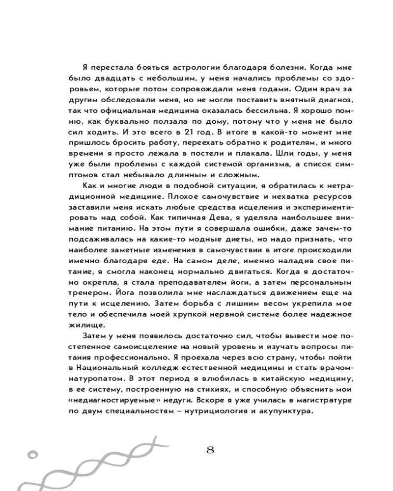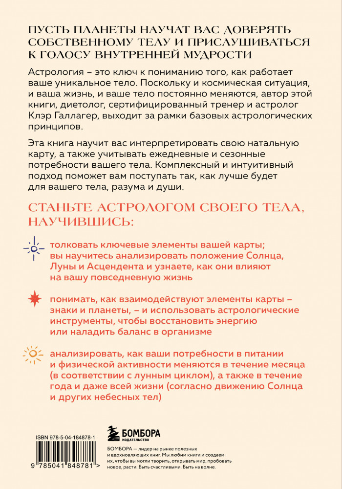 Серия: По млечному пути. Западная астрология Астрология — еще один ключ к пониманию того, как работает ваше уникальное тело. Поскольку и космическая ситуация, и ваша жизнь, и ваше тело постоянно меняются, автор выходит за рамки базовых астрологических принципов. Книга научит вас интерпретировать свою натальную карту, а также учитывать ежедневные и сезонные потребности вашего тела. Комплексный и интуитивный подход поможет вам поступать так, как будет лучше персонально для вас, для вашего разума и души. |