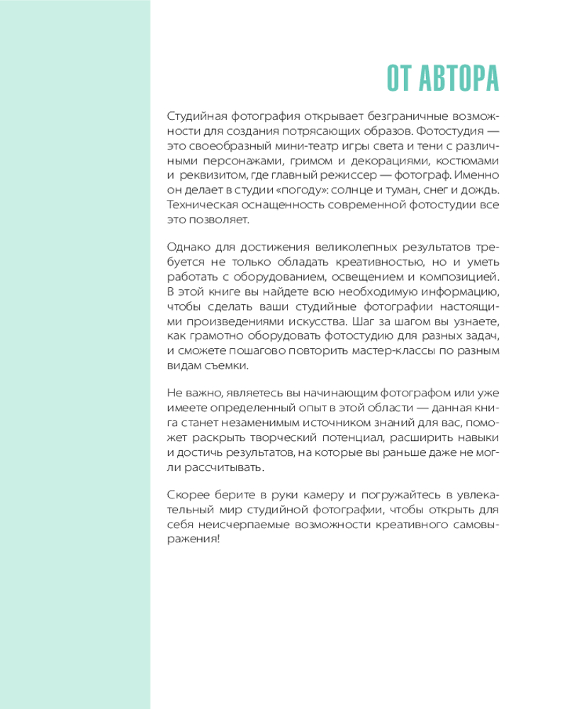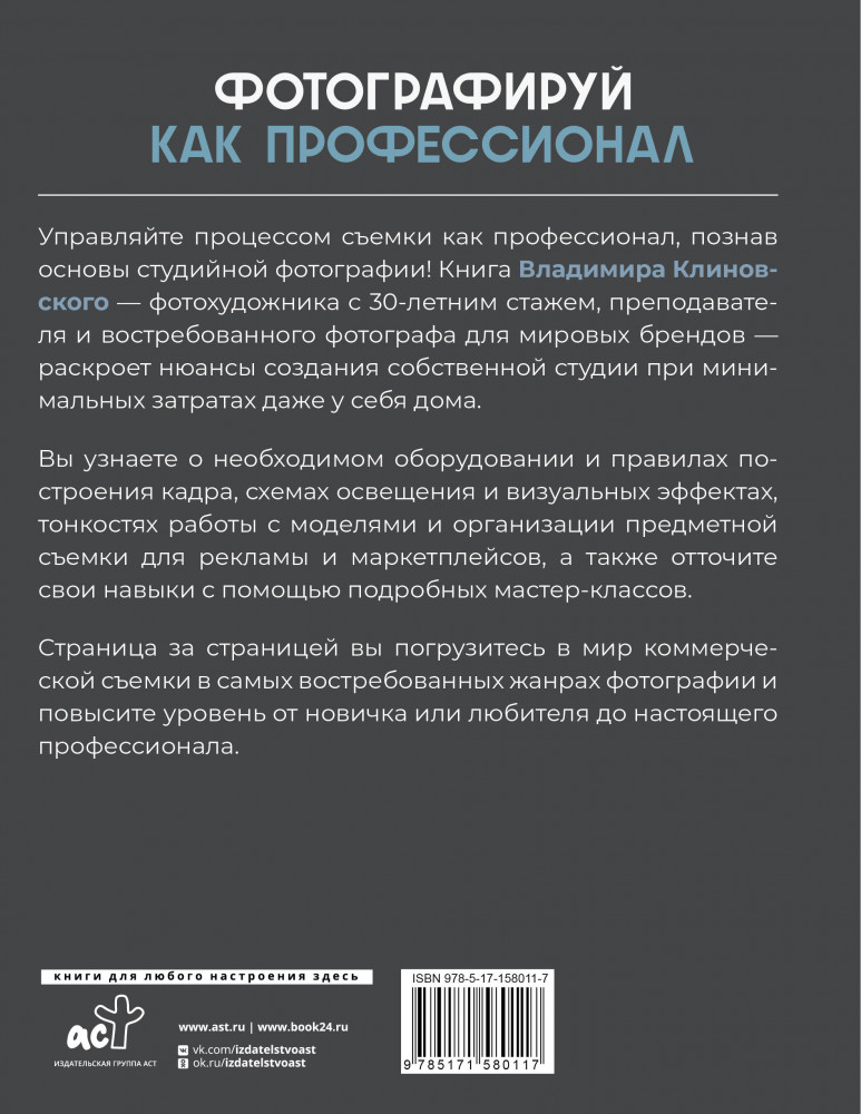 Фотографируй как профессионал. Особенности студийной фотографииВ данный момент этот товар отсутствует в продаже. Возможно, у нас найдется аналогичный или похожий товар здесь. Серия: Фотография для всех Управляйте процессом съемки как профессионал, познав основы студийной фотографии! Книга Владимира Клиновского — фотохудожника с 30-летним стажем, преподавателя и востребованного фотографа для мировых брендов — раскроет нюансы создания собственной студии при минимальных затратах даже у себя дома. Вы узнаете о необходимом оборудовании и правилах построения кадра, схемах освещения и визуальных эффектах, тонкостях работы с моделями и организации предметной съемки для рекламы и маркетплейсов, а также отточите свои навыки с помощью подробных мастер-классов. Страница за страницей вы погрузитесь в мир коммерческой съемки в самых востребованных жанрах фотографии и повысите уровень от новичка или любителя до настоящего профессионала. |