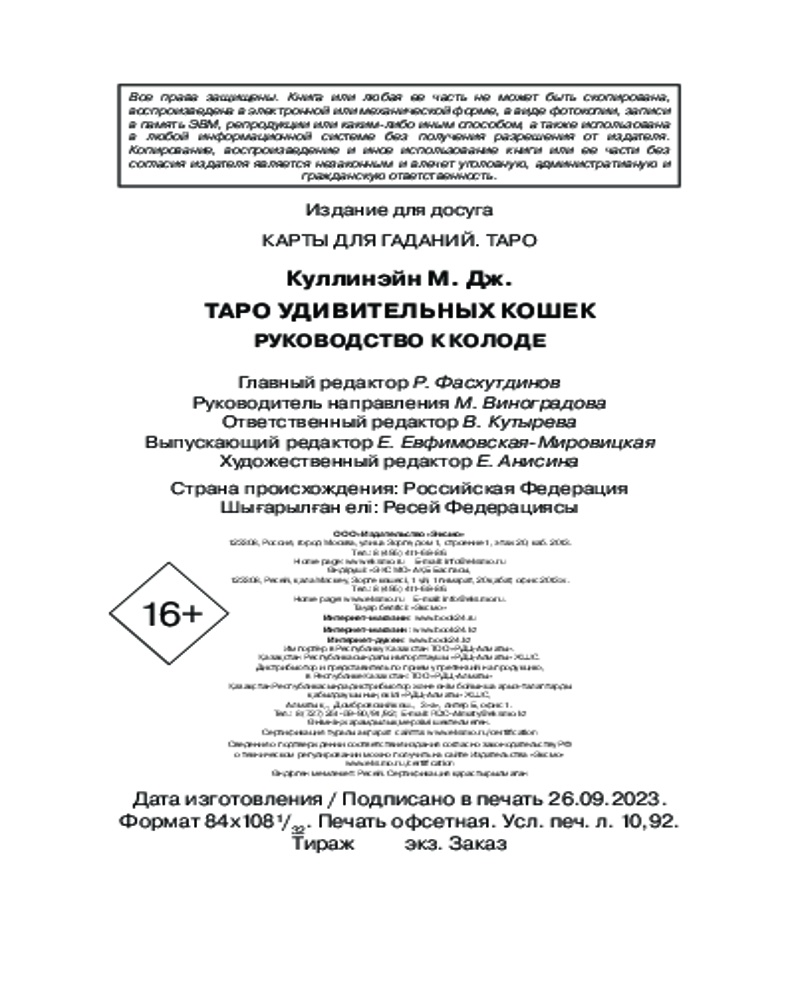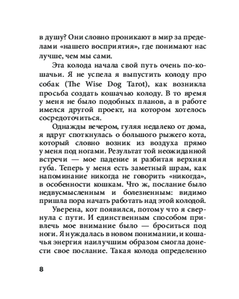 💳 Оплатить за товар можно при получении 🇰🇿 Есть бесплатная доставка по Казахстану от 1 дня 🎁 Копите бонусы с каждой покупки Серия: Карты для гаданий. Таро «Таро удивительных кошек» М.Дж. Куллинэйн — 100% кошачья колода. Она рассказывает о самых разных кошках: от бродячих попрошаек до упитанных толстяков, от безволосых сфинксов до пушистых гигантов. На каждой карте этого Таро, созданного в традиции классического Таро Уэйта, хорошие, плохие, грациозные и неуклюжие кошки совершают свое собственное «Путешествие Шута» — и делятся с нами, кожаными двуногими, своими открытиями. |