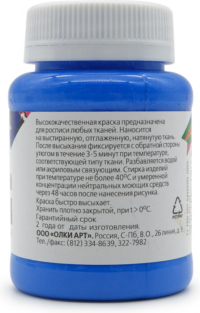 Акриловые краски Olki подходят для любых тканей: шелковых, хлопчатобумажных, льняных, синтетических. Позволяют работать в различных техниках: аэрография, трафаретная роспись, батик, шибори. Не содержат вредных веществ и подходят даже для детского творчества. Разные цвета допускается смешивать между собой или разбавлять. Чтобы разбавить краску, добавьте небольшое количество воды или специального растворителя. Краски быстро высыхают, не тускнеют и не выгорают на солнце. Изделие, расписанное акрилом, можно стирать в ручном режиме при температуре 30–40 градусов Цельсия.