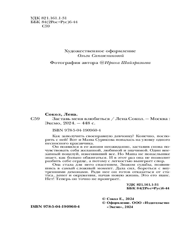 Заставь меня влюбитьсяВ данный момент этот товар отсутствует в продаже. Возможно, у нас найдется аналогичный или похожий товар здесь. Серия: Романтика Лены Сокол Как заполучить своенравную девчонку? Конечно, поспорить с ней! Вот и Маша Сурикова попалась на уловку одного несносного красавчика. Он появился в ее жизни неожиданно, заставив снова почувствовать себя желанной, любимой и значимой. Один внезапный поцелуй, изменивший все. Но Маша не понаслышке знает, как больно обжигаться. И в этот раз она не позволит разбить себе сердце, а потому с легкостью выиграет спор. Она стала для него спасением. Знаком судьбы, появившись в самый сложный момент. Дала сил, бороться с внутренними демонами. Ради нее он готов отказаться от статуса, денег и окружения, начав новую жизнь. Это его шанс. Нет! Теперь он точно не проиграет. |