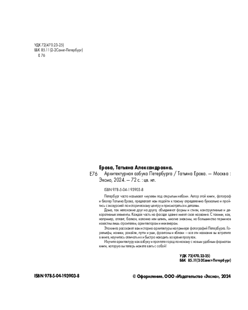 💳 Оплатить за товар можно при получении 🇰🇿 Есть бесплатная доставка по Казахстану от 1 дня 🎁 Копите бонусы с каждой покупки Серия: Возьми с собой! Книги о городах и архитектуре в удобном формате Фотограф и блогер Татьяна Ерова обожает прогуливаться по любимому Петербургу и делать красивые снимки. Вместе с ней читатели смогут не только полюбоваться роскошными зданиями «северной столицы», но и научиться читать их, как настоящие архитекторы. Ведь каждая деталь имеет название и предназначение! Изучите архитектуру как азбуку и прочтите город по-новому с новым удобным форматом книги, которую вы теперь можете взять с собой! В книге «Архитектурная азбука Петербурга» автор последовательно, от атлантов до яблока, разбирает термины, течения и стили на примере дворцов, доходных домов и мостов города. |