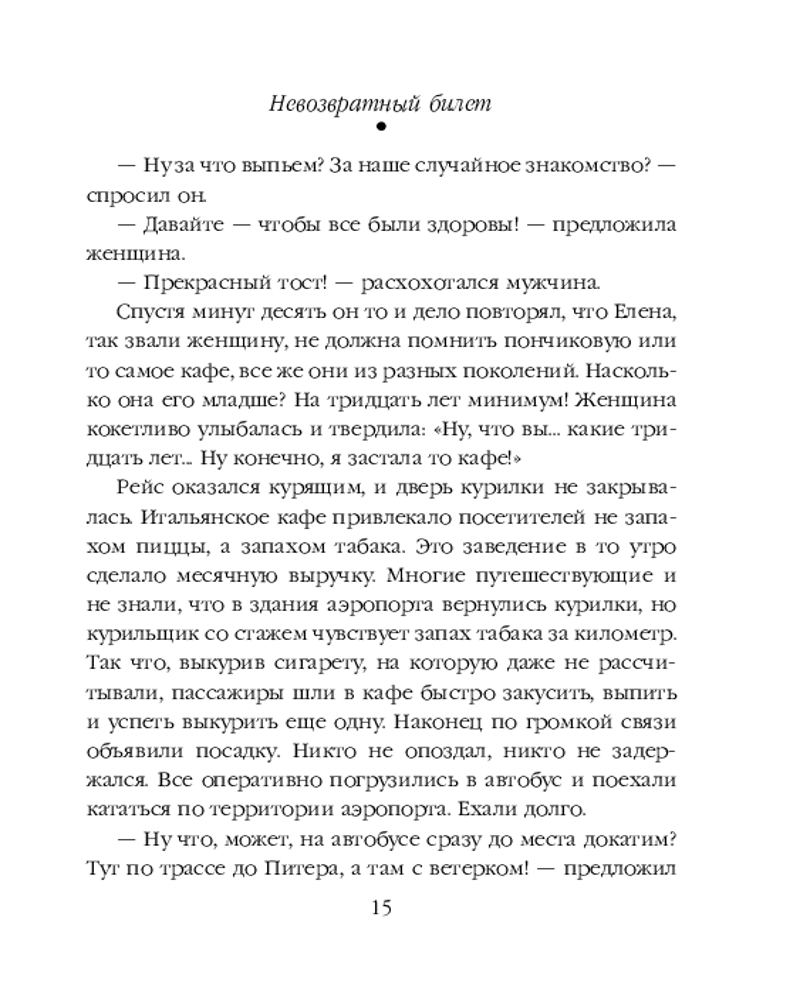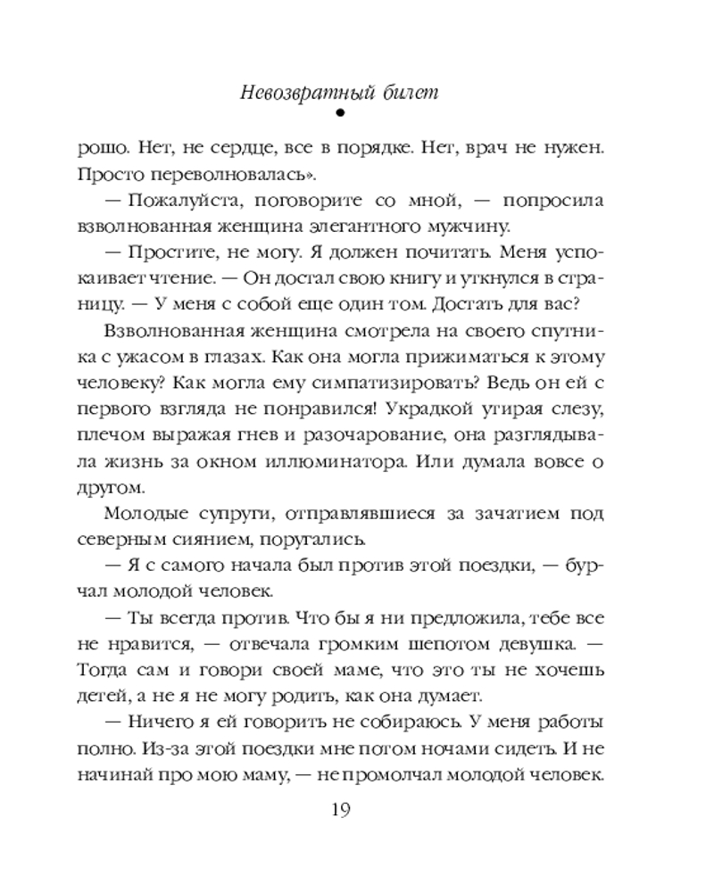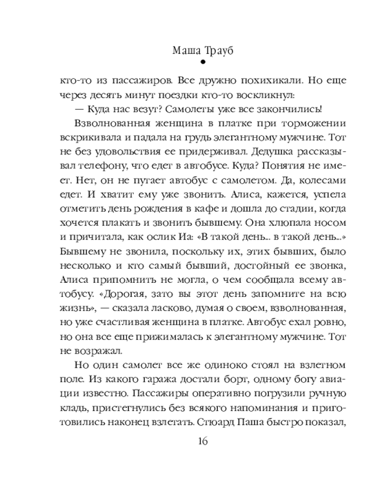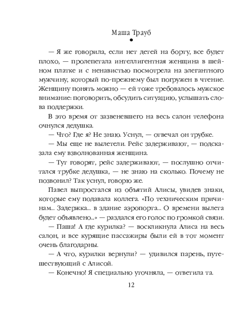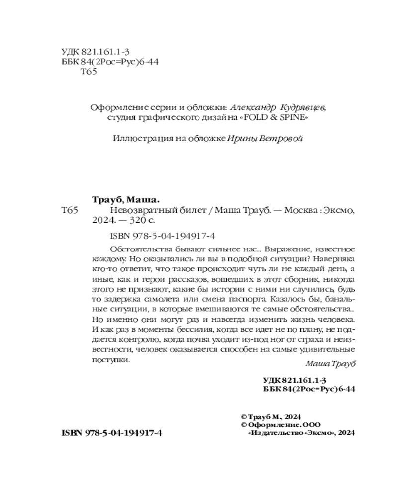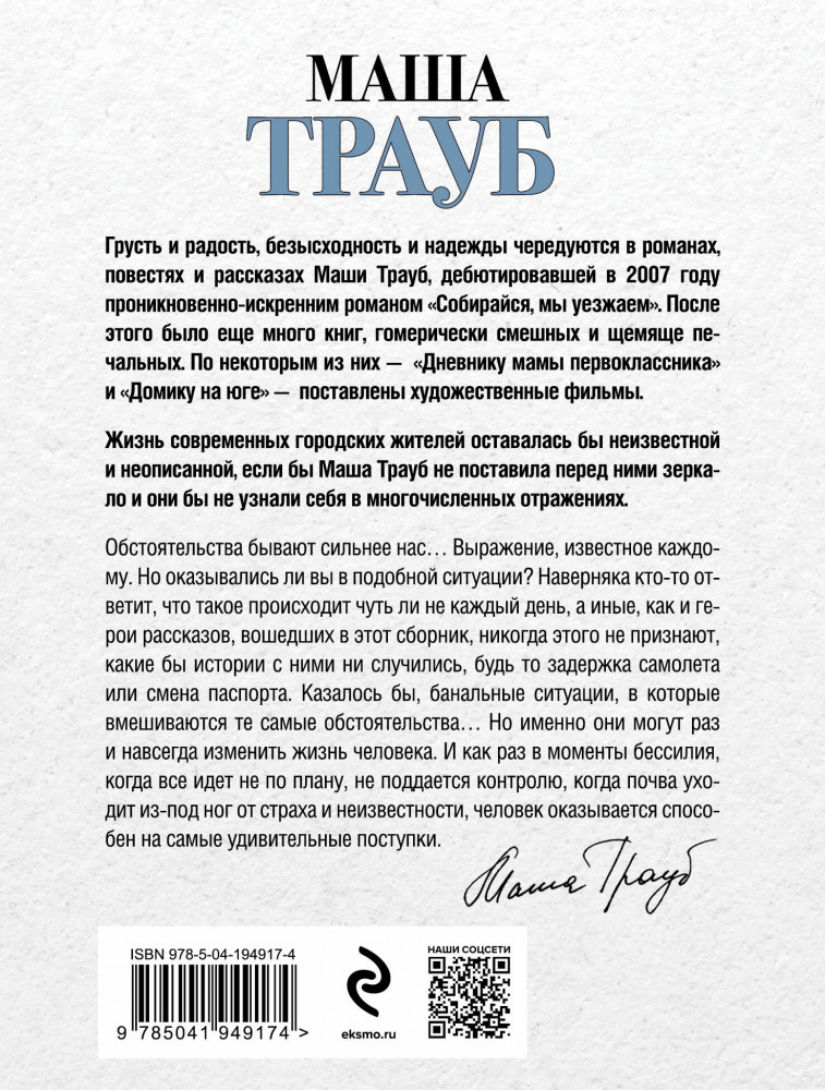 Невозвратный билетВ данный момент этот товар отсутствует в продаже. Возможно, у нас найдется аналогичный или похожий товар здесь. Серия: Проза Маши Трауб. Жизнь как в зеркале (обложка) Маша Трауб в который раз удивляет своих читателей. «Невозвратный билет» — сборник из четырех историй, калейдоскоп чужих судеб, которые переживаешь как свои. Ситуации, знакомые каждому, когда случай вмешивается в размеренное течение нашей жизни, разубеждая в том, что мы можем ею управлять. Но ведь бывает, что в момент наивысшего напряжения, когда, казалось бы, все проиграно, мы собираемся и все меняем, переигрываем судьбу. Не даем обстоятельствам оказаться сильнее нас. |