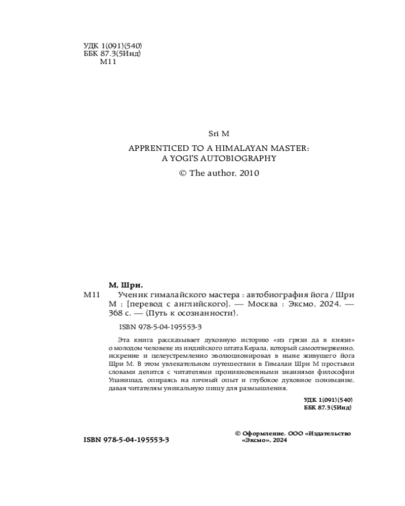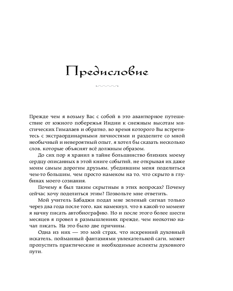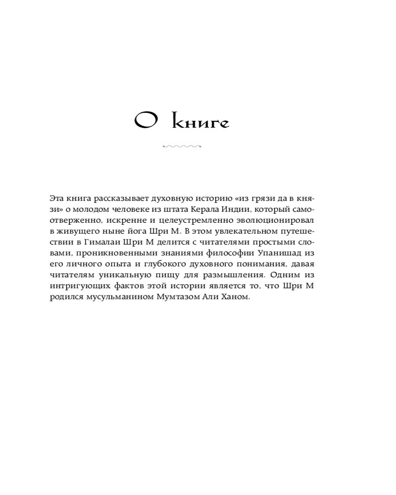 Серия: Путь к осознанности. Книги о выборе духовного пути Эта книга рассказывает духовную историю «из грязи да в князи» о молодом человеке из индийского штата Керала, который самоотверженно, искренне и целеустремленно эволюционировал в ныне живущего йога Шри М. В этом увлекательном путешествии в Гималаи Шри М простыми словами делится с читателями проникновенными знаниями философии Упанишад, опираясь на личный опыт и глубокое духовное понимание, давая читателям уникальную пищу для размышления. |