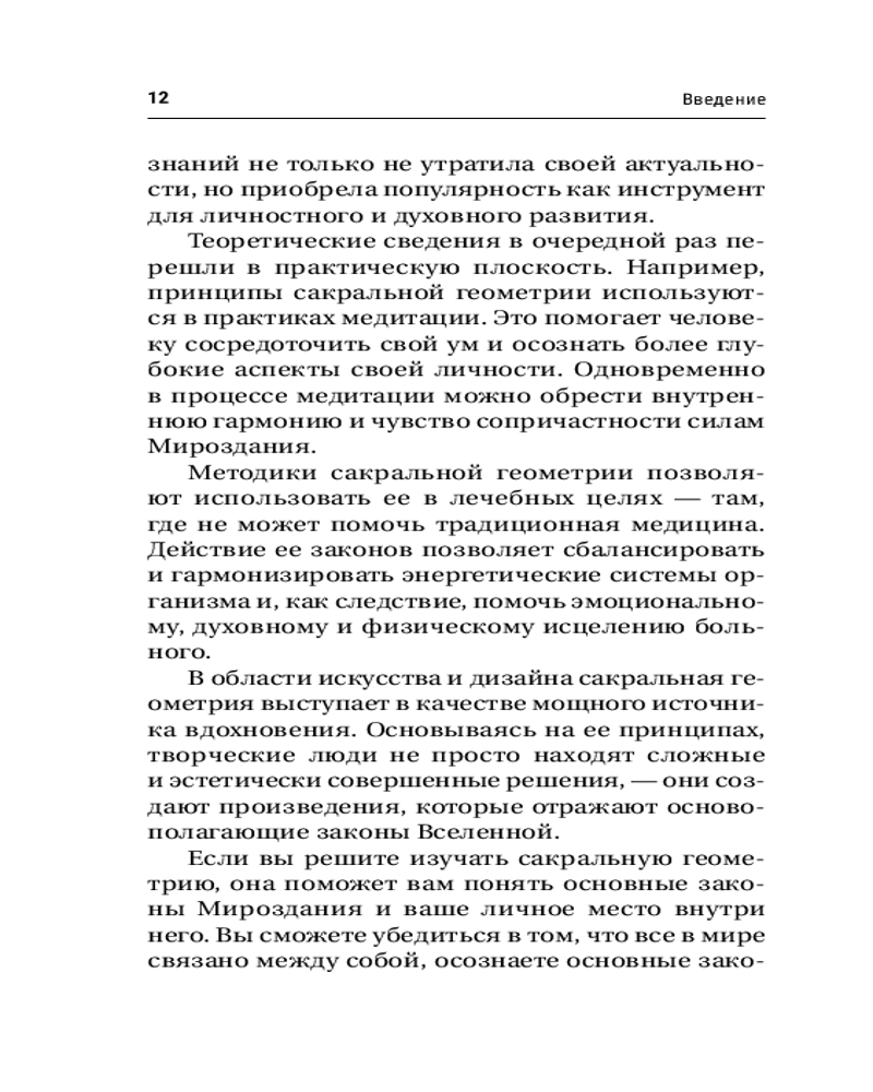 💳 Оплатить за товар можно при получении 🇰🇿 Есть бесплатная доставка по Казахстану от 1 дня 🎁 Копите бонусы с каждой покупки Серия: Школа эзотерики Сакральная геометрия — это древняя система символов и форм, олицетворяющая гармонию и баланс во Вселенной. Она базируется на убеждении, что любая точка, линия или фигура имеет свое собственное значение, свой духовный и философский смысл. Они имеют связь с космическим порядком и влияют на энергию и сознание человека. Сакральная геометрия встречается в различных культурах и религиях, включая египетскую, греческую, индийскую, майя и другие. |