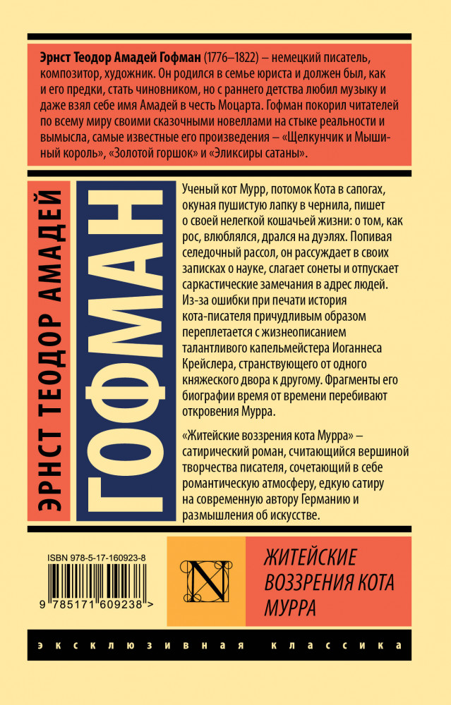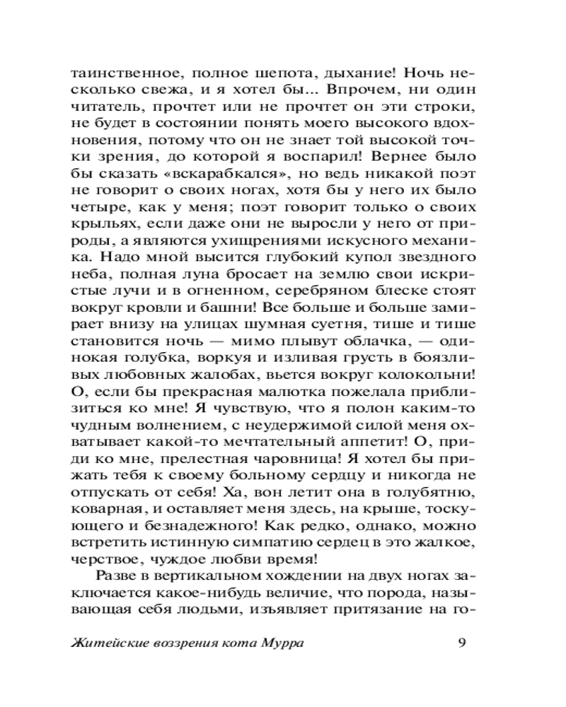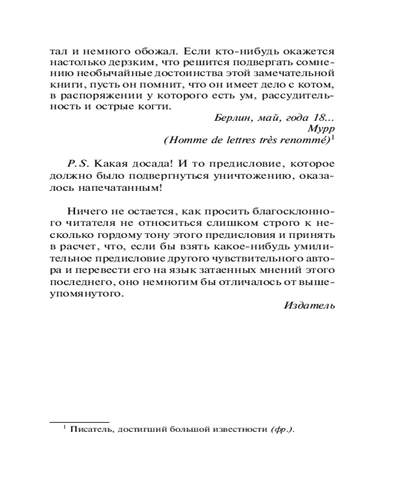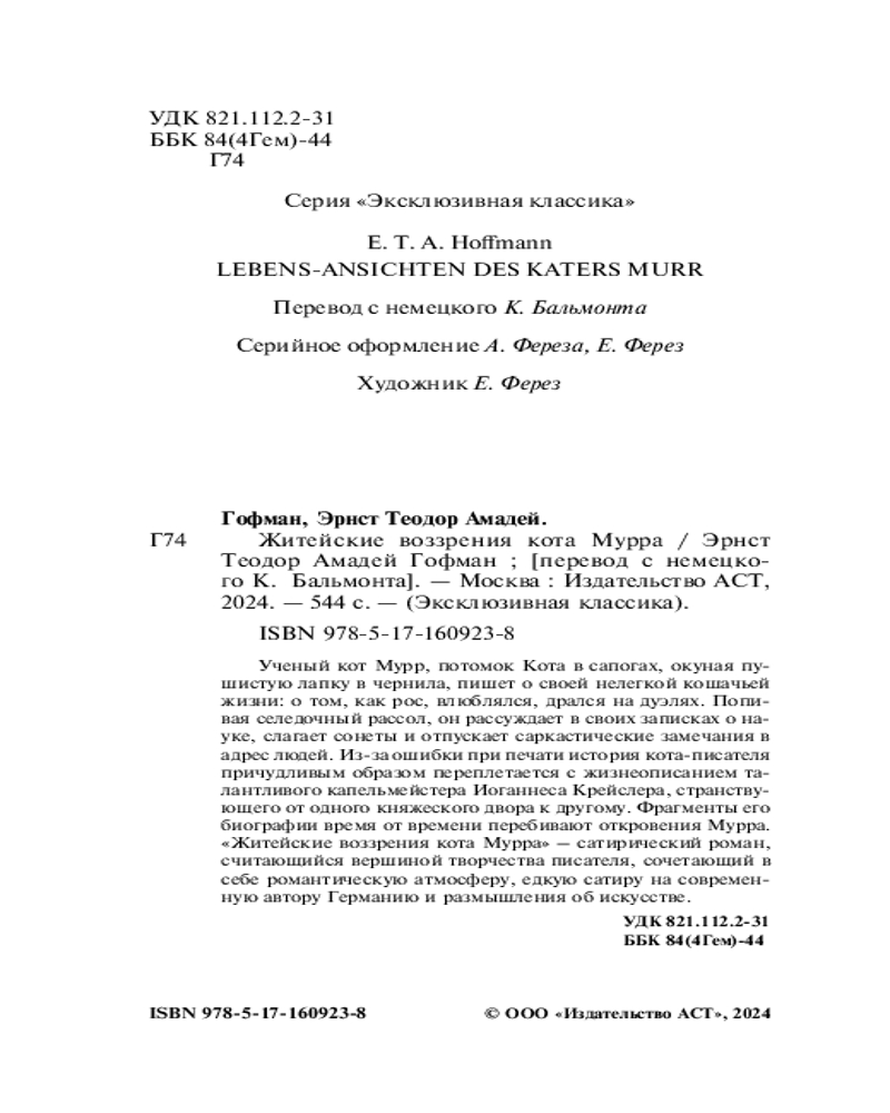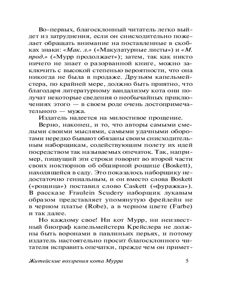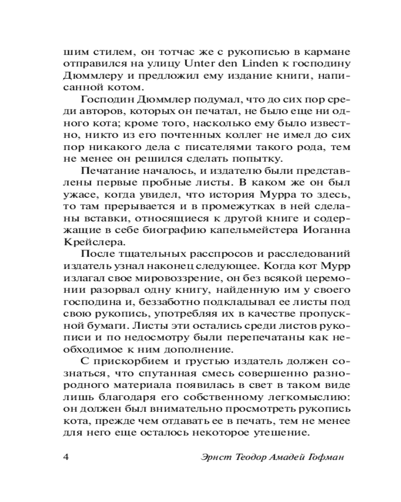 💳 Оплатить за товар можно при получении 🇰🇿 Есть бесплатная доставка по Казахстану от 1 дня 🎁 Копите бонусы с каждой покупки Серия: Эксклюзивная классика Ученый кот Мурр, потомок Кота в сапогах, окуная пушистую лапку в чернила, пишет о своей нелегкой кошачьей жизни: о том, как рос, влюблялся, дрался на дуэлях. Попивая селедочный рассол, он рассуждает в своих записках о науке, слагает сонеты и отпускает саркастические замечания в адрес людей. Из-за ошибки при печати история кота-писателя причудливым образом переплетается с жизнеописанием талантливого капельмейстера Иоганнеса Крейслера, странствующего от одного княжеского двора к другому. Фрагменты его биографии время от времени перебивают откровения Мурра. |