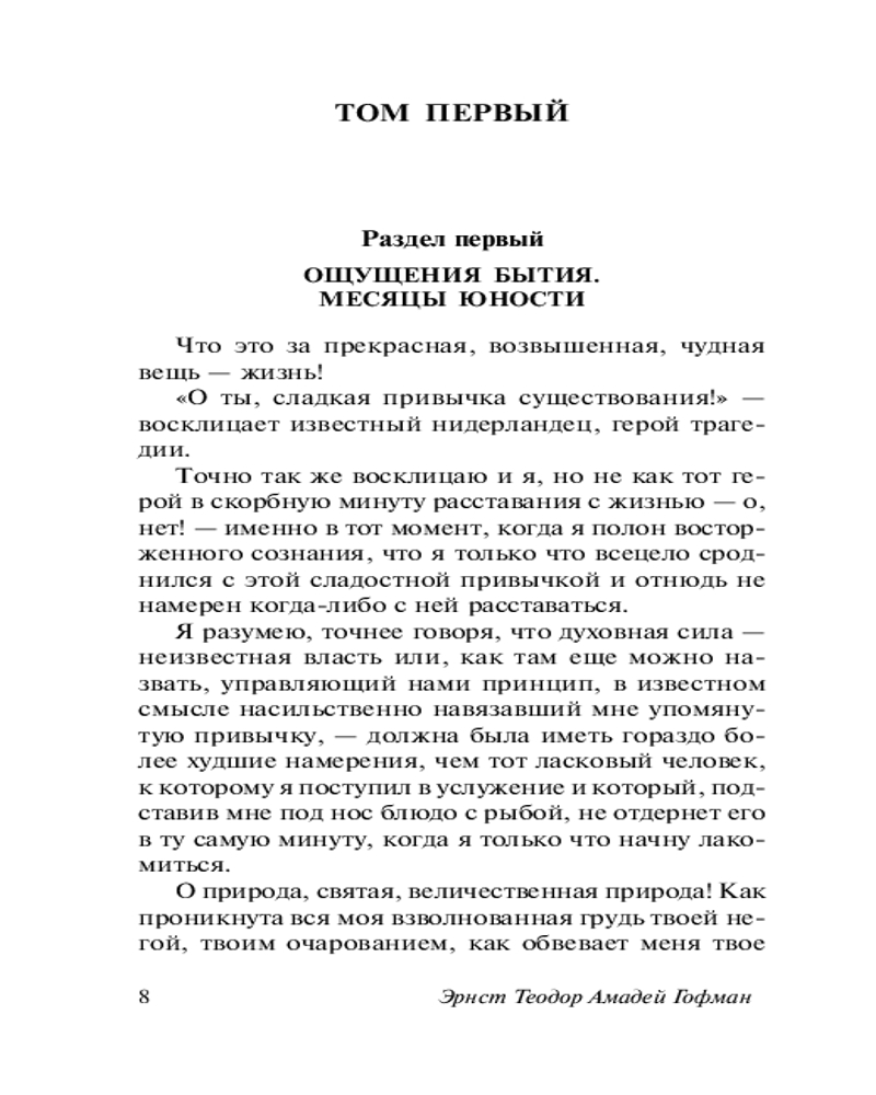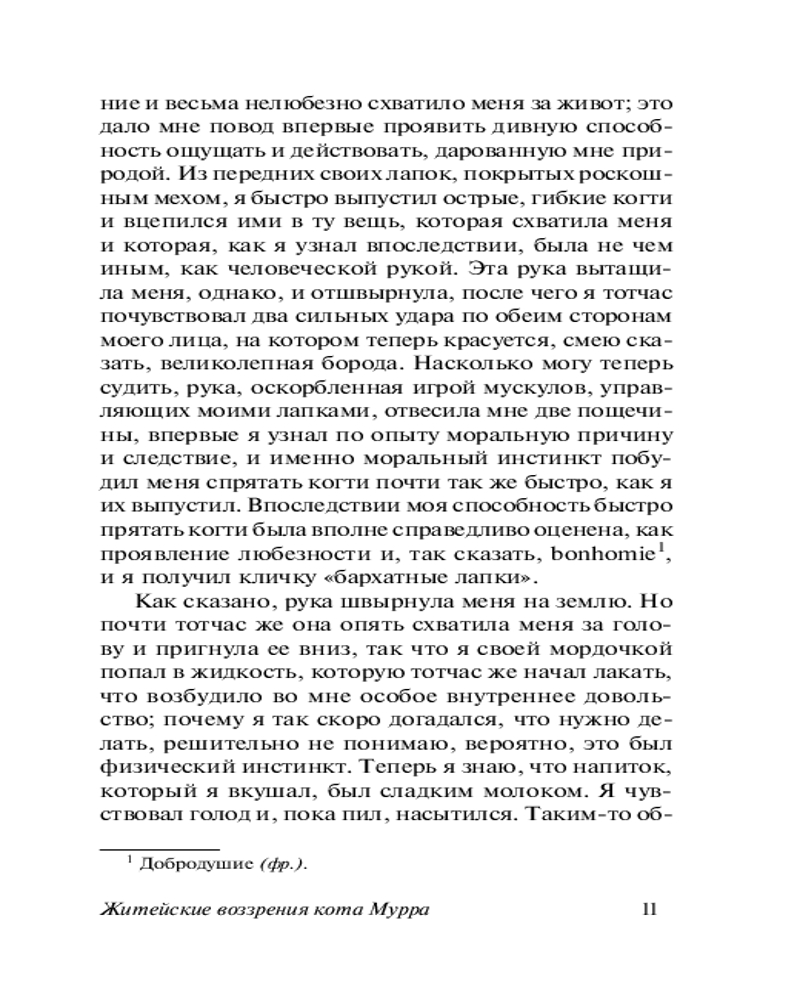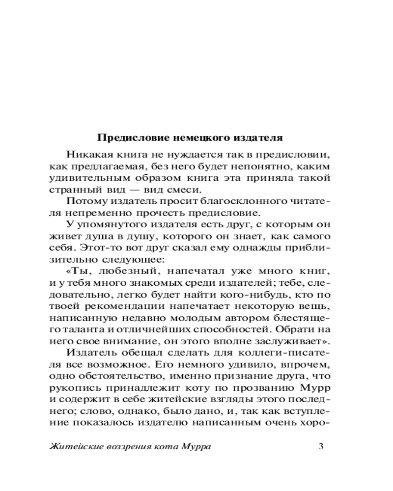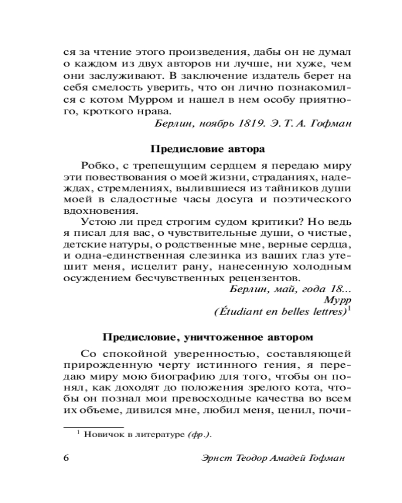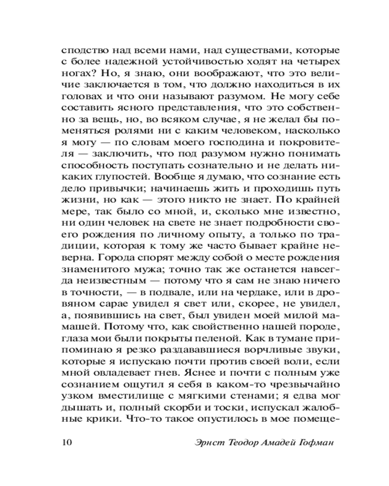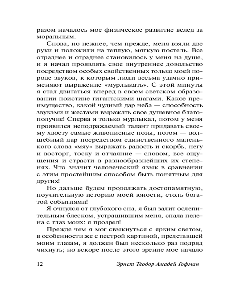 💳 Оплатить за товар можно при получении 🇰🇿 Есть бесплатная доставка по Казахстану от 1 дня 🎁 Копите бонусы с каждой покупки Серия: Эксклюзивная классика Ученый кот Мурр, потомок Кота в сапогах, окуная пушистую лапку в чернила, пишет о своей нелегкой кошачьей жизни: о том, как рос, влюблялся, дрался на дуэлях. Попивая селедочный рассол, он рассуждает в своих записках о науке, слагает сонеты и отпускает саркастические замечания в адрес людей. Из-за ошибки при печати история кота-писателя причудливым образом переплетается с жизнеописанием талантливого капельмейстера Иоганнеса Крейслера, странствующего от одного княжеского двора к другому. Фрагменты его биографии время от времени перебивают откровения Мурра. |