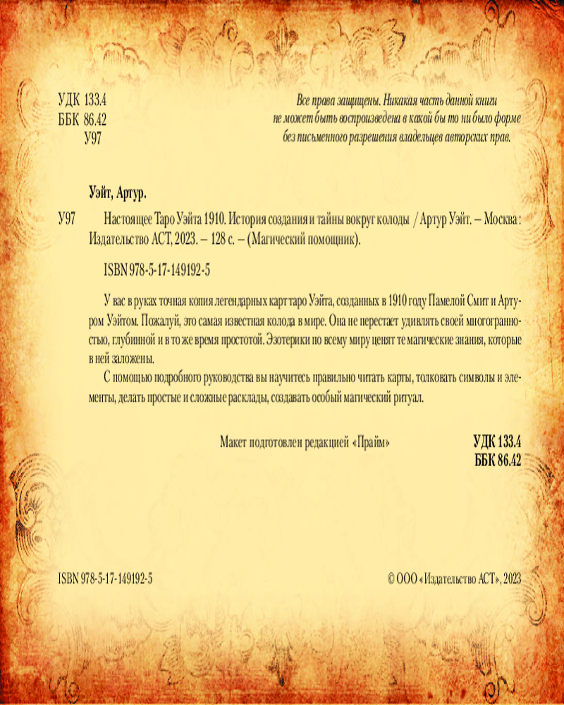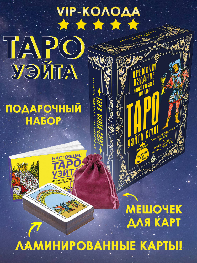 Серия: Карты Таро (Подарочная коробка с картами и книгой) Та самая, классическая колода Артура Уэйта в премиальном VIP-качестве! Ламинированные карты и мешочек для хранения в комплекте станут идеальным подарком и дополнением в коллекцию как для начинающих, так и для профессиональных тарологов. |