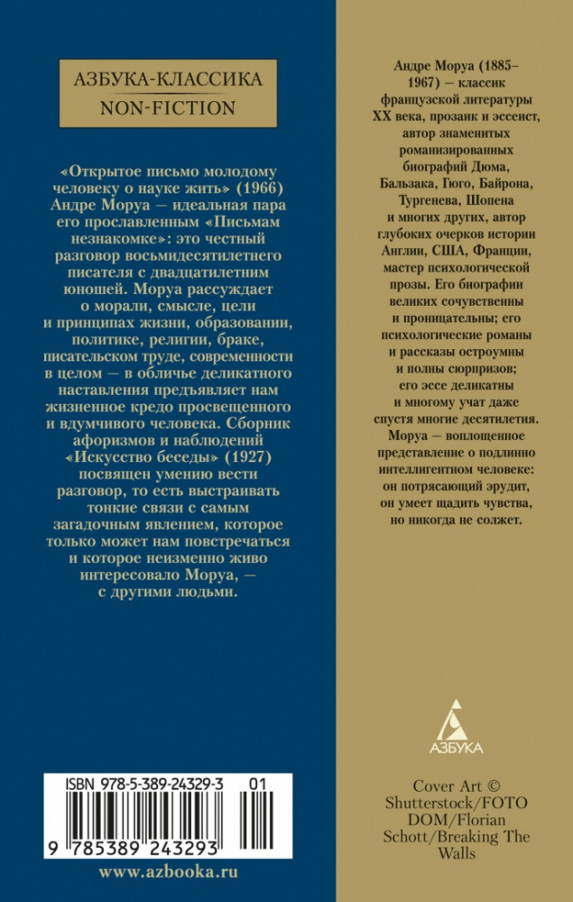 Открытое письмо молодому человеку о науке жить. Искусство беседы. Афоризмы и максимы. Сборникинтересное содержание много цитат афоризмы В данный момент этот товар отсутствует в продаже. Возможно, у нас найдется аналогичный или похожий товар здесь. Серия: Азбука-Классика. Non-Fiction Андре Моруа, классик французской литературы XX века, прозаик и эссеист, потрясающий эрудит, автор изысканных новелл и романов, знаменитых романизированных биографий Дюма, Бальзака, Гюго, Байрона и многих других, создатель глубоких очерков истории Англии, США, Франции, на склоне лет вновь обратился к жанру философского эссе. «Открытое письмо молодому человеку о науке жить» (1966) составляет идеальную пару его прославленным «Письмам незнакомке»: это честный разговор восьмидесятилетнего писателя с двадцатилетним юношей. Моруа рассуждает о морали, смысле, цели и принципах жизни, образовании, политике, религии, браке, писательском труде, современности в целом — в обличье деликатного наставления предъявляет нам жизненное кредо просвещенного и вдумчивого человека, и его опыт способен многому нас научить. Сборник афоризмов и наблюдений «Искусство беседы» (1927) посвящен умению вести разговор, то есть выстраивать тонкие связи с самым загадочным явлением, которое только может нам повстречаться и которое неизменно живо интересовало Моруа, — с другими людьми. |